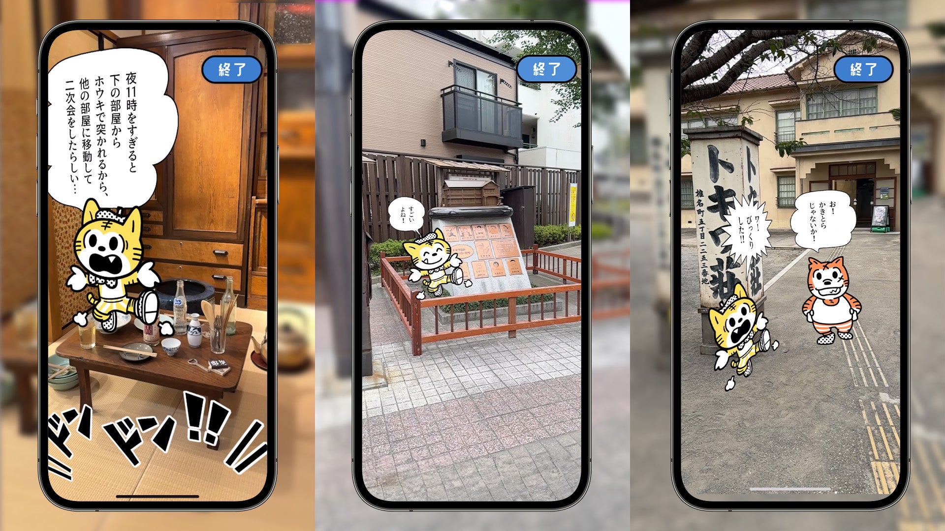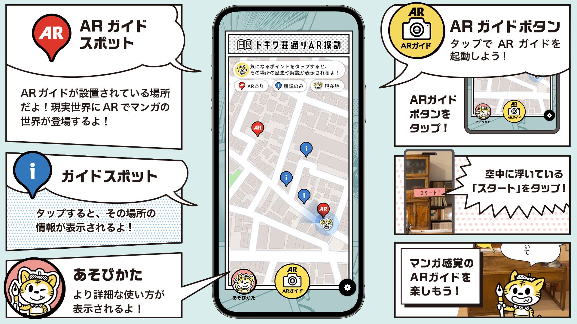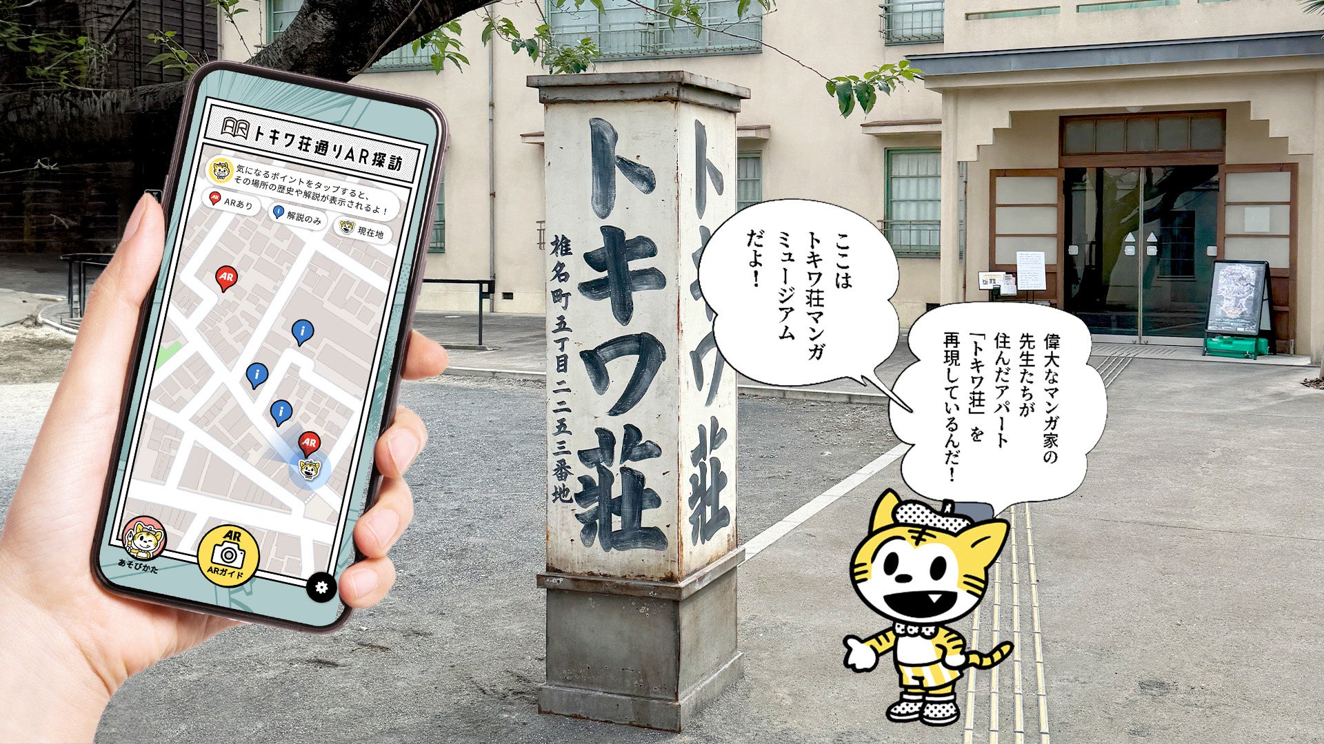 「トキワ荘通りAR探訪」は、豊島区南長崎エリアに残るトキワ荘ゆかりのスポットを、AR技術を駆使してマンガの一コマのような世界観で案内するアプリです。フキダシやオノマトペを活用したマンガ的なデザイン表現や、地域の公式キャラクター「かきとらさん」を用いた親しみやすいガイドを通じて、現地でのマンガ文化体験を一層深めることができます。