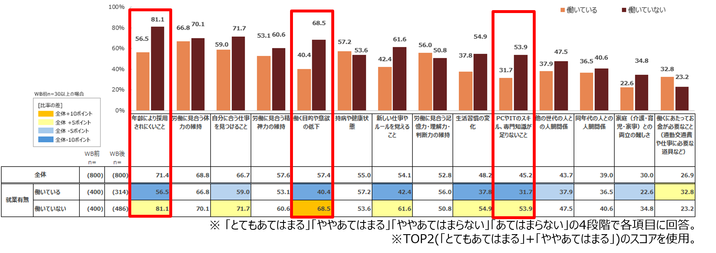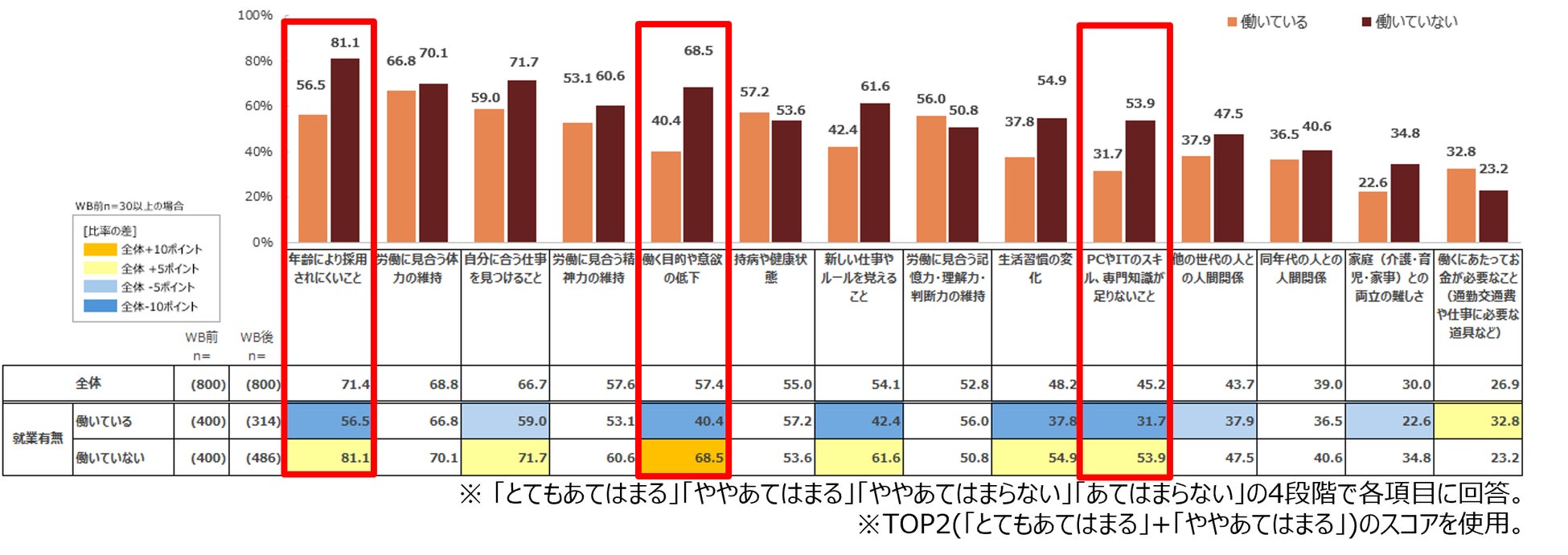 現在の就労有無に関わらず、働くことに対して不安や障壁を感じる点について尋ねたところ、全体では「年齢により採用されにくいこと」が71.4%で1位となった。働いていない人の方が働いている人より不安が大きい傾向が見られる。差が大きかったのは、「働く目的や意欲の低下」が28.1ポイント、「年齢により採用されにくいこと」が24.6ポイント、「PCやITスキル、専門スキルが足りないこと」が22.2ポイントの差があった。