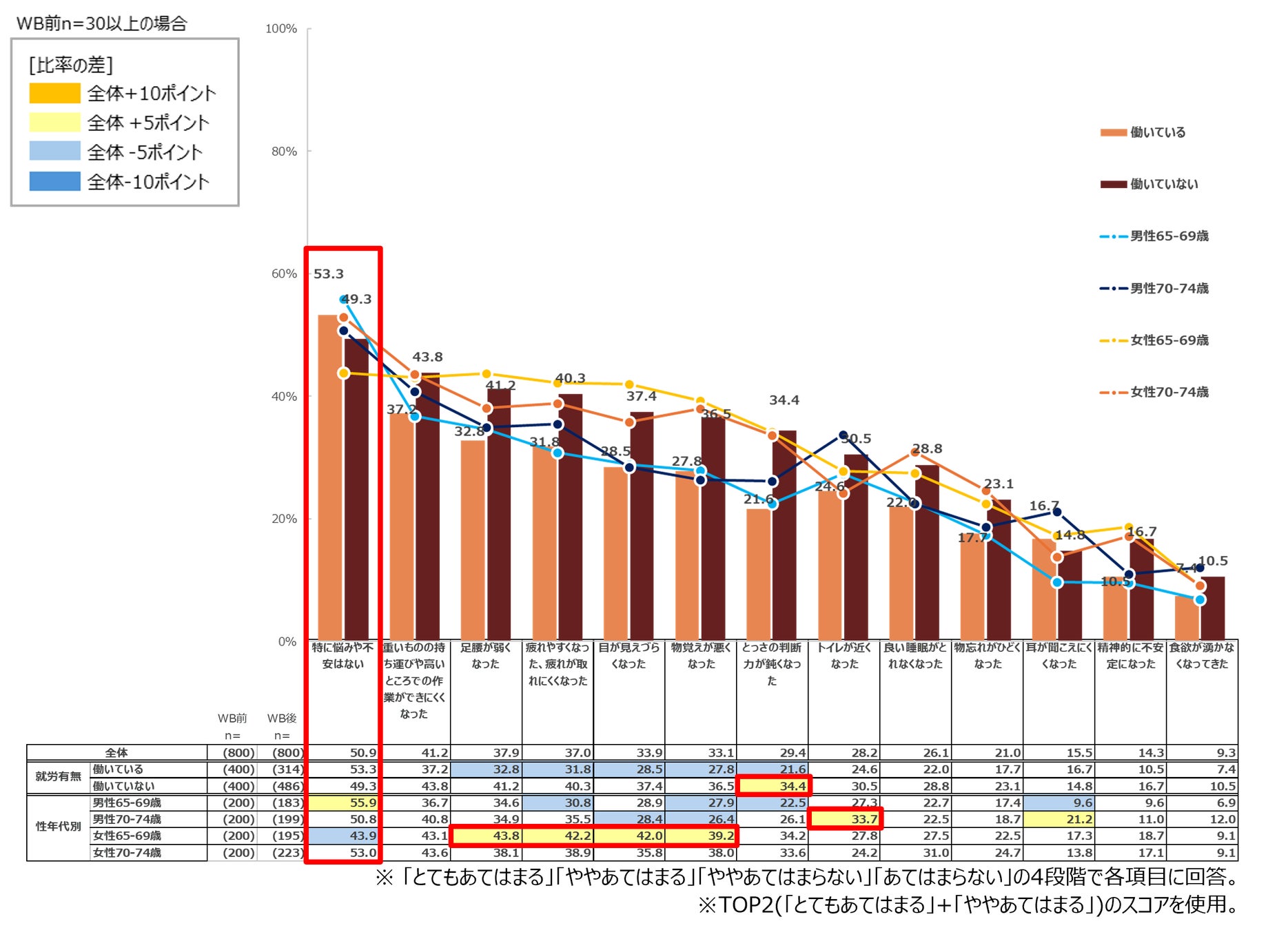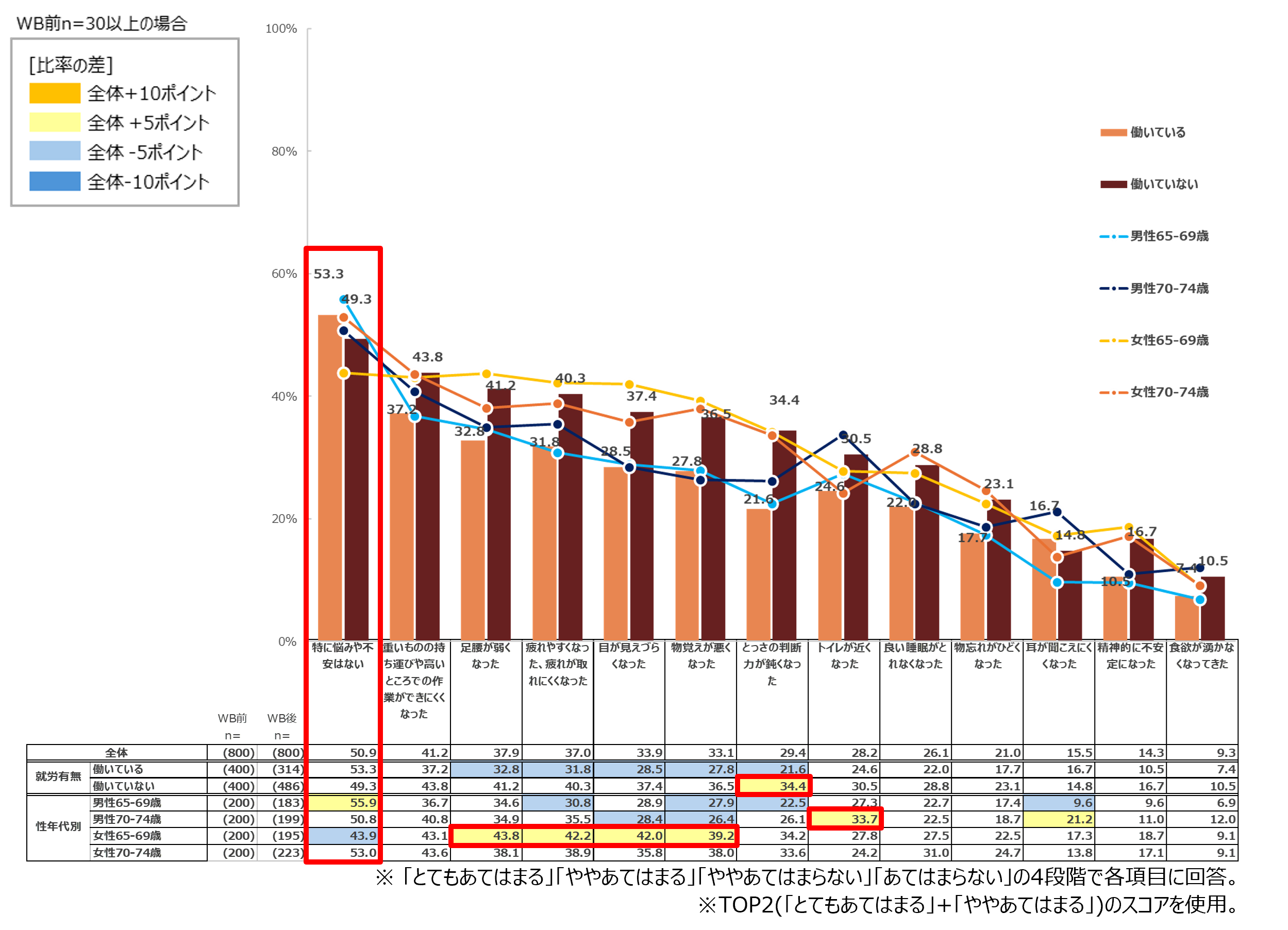 仕事をする上で感じている健康面、体力面に関する悩みや不安について尋ねたところ、全体では50.9%が「特に悩みや不安はない」が1位になった。働いていない人は「とっさの判断力が鈍くなった」が34.4%で働いている人(21.6%)と差が見られた。男性の70~74歳は他の層に比べて「トイレが近くなった」が33.7%で仕事への影響が見られた。女性の65~69歳は「足腰が弱くなった」「疲れやすくなった、疲れが取れにくくなった」「目が見えづらくなった」「物覚えが悪くなった」といった身体機能面での仕事への影響を強く感じていることも分かった。