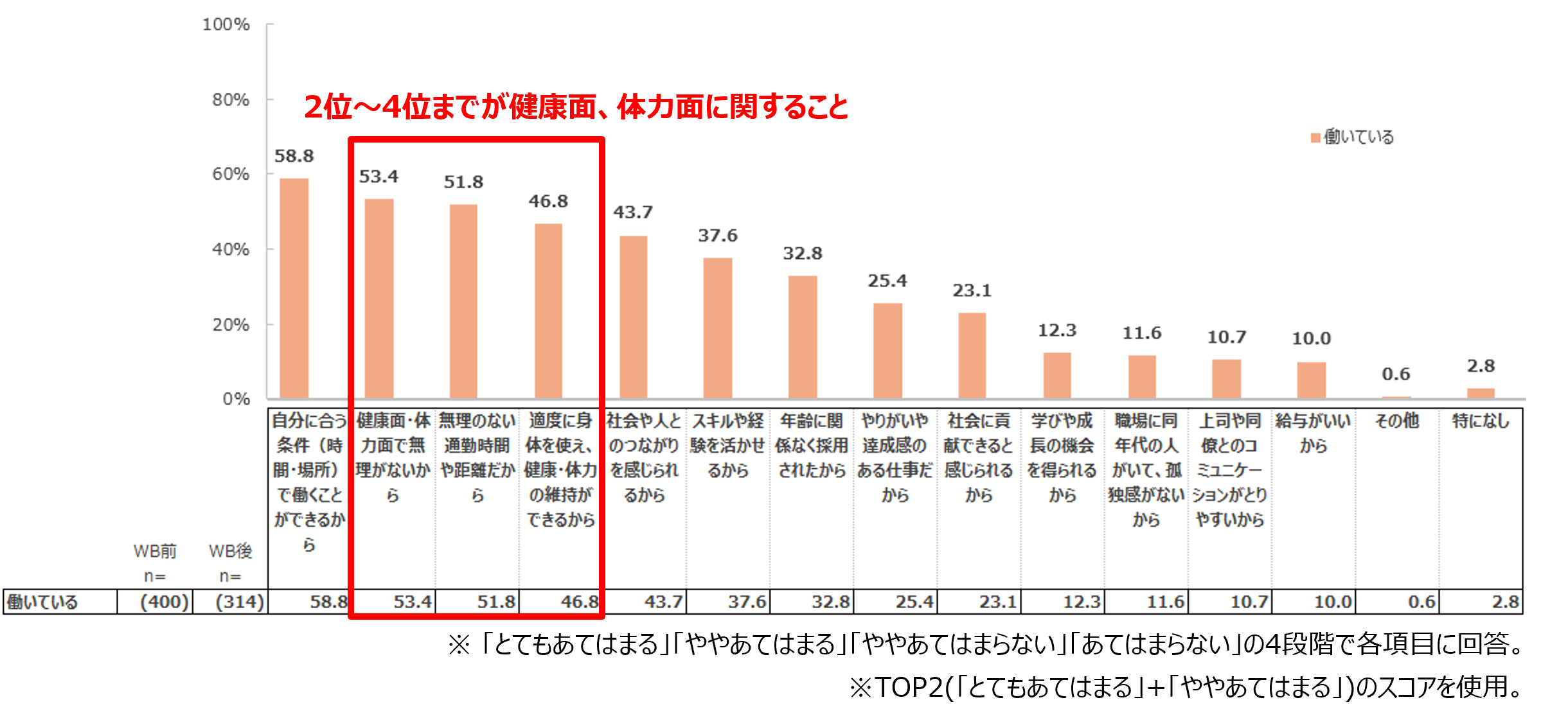 働いている人に今の職場で働いている理由を尋ねたところ、「自分に合う条件(時間・場所)で働くことができるから」の58.8%が1位になり、2位から4位までが健康面、体力面に関する項目だった。働く人は、業務の内容よりも自身の体調と合わせることができる職場や働きやすさを重視していることが分かった。