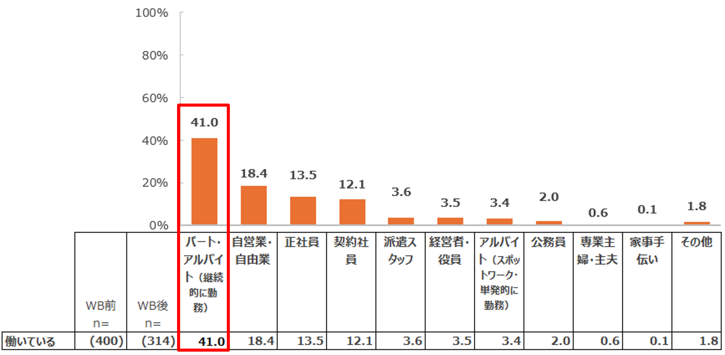 働いている人に雇用形態を尋ねたところ、41.0%が「パート・アルバイト(継続的に勤務)」と回答した。正社員は13.5%という結果で、多くは非正規雇用であることが分かった。また、単発的に働くアルバイト(スポットワーク)も小規模ながら存在している。