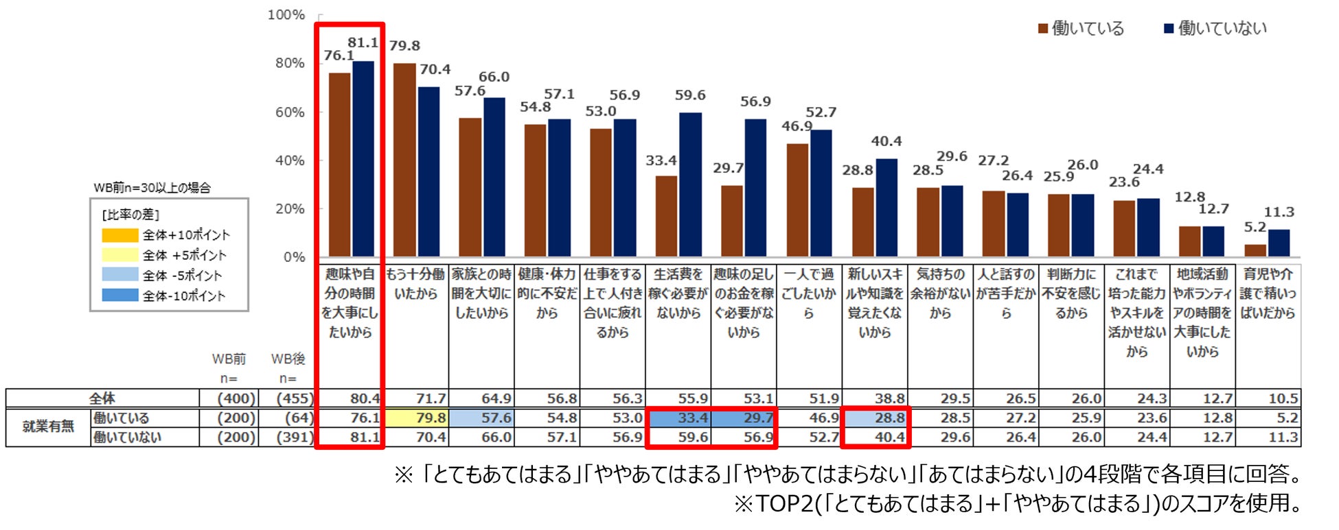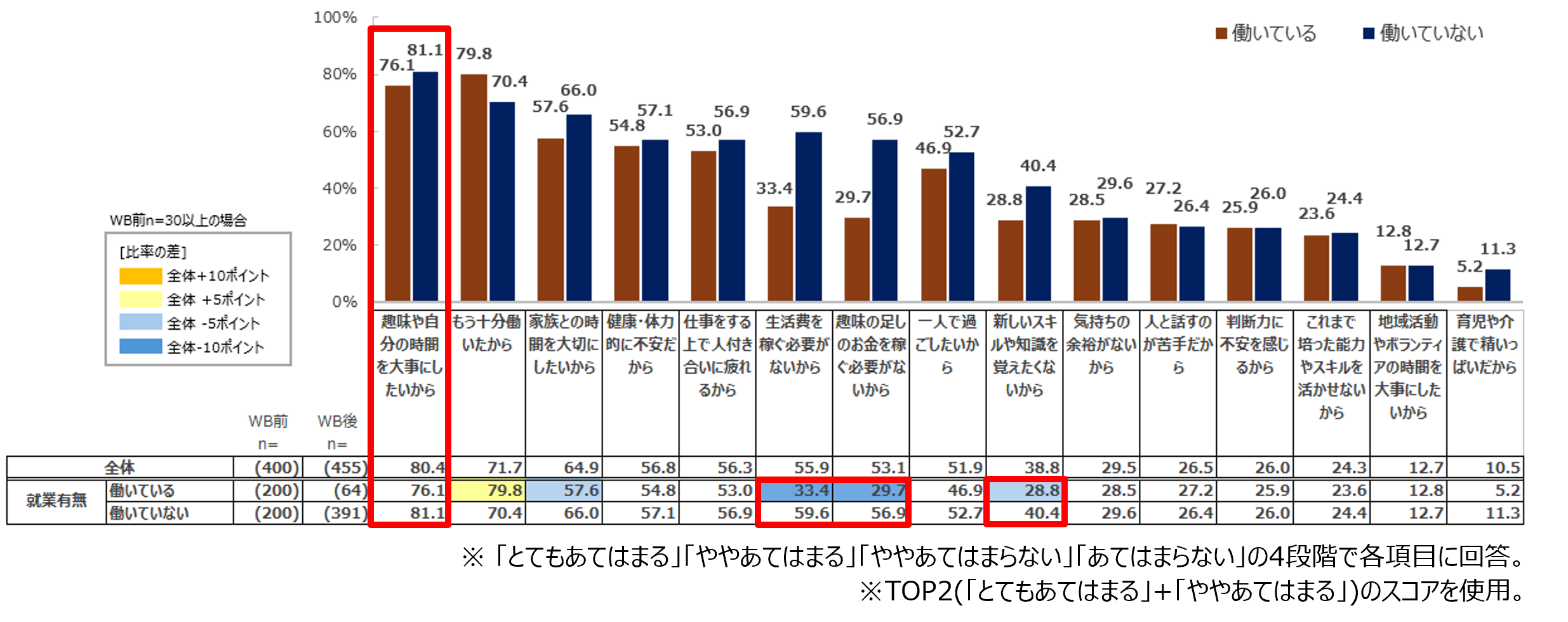 働いていない人で働きたくない理由が働いている人と10ポイント以上の差がついたのは、「生活費を稼ぐ必要がないから」(59.6%)、「趣味の足しのお金を稼ぐ必要がないから」(56.9%)、「新しいスキルや知識を覚えたくないから」(40.4%)であった。