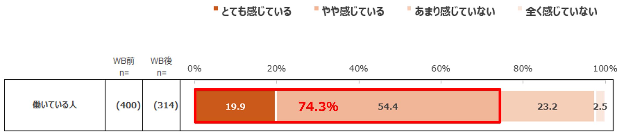 働いている人に、今の仕事への満足感や充実感を尋ねたところ、74.3%が満足感や充実感を感じていると回答した。「全く感じていない」は2.5%にとどまり、業種や職種に関わらず、働いている人の多くは今の仕事を好意的にとらえていることが分かった。