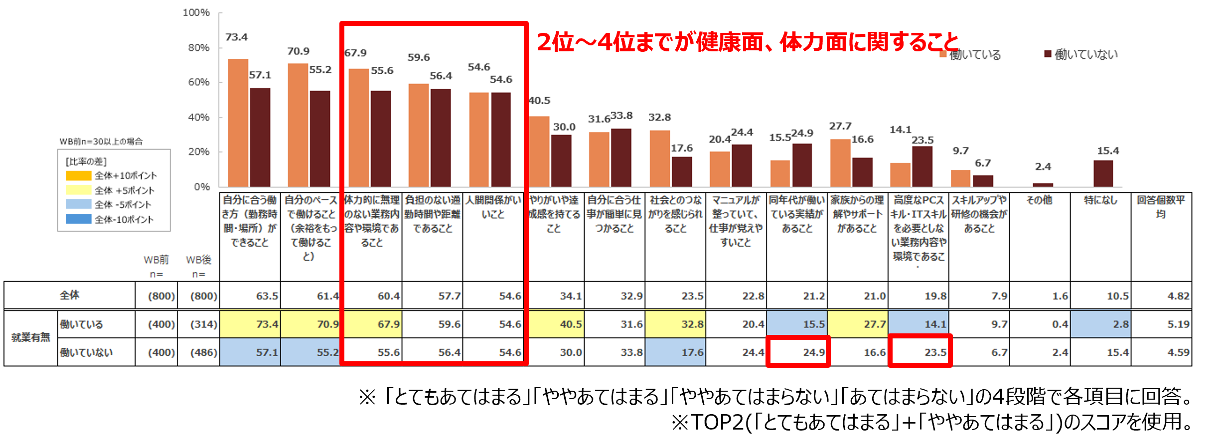 働いていない人は「同年代が働いている実績があること」(24.9%)、「高度なPCスキル・ITスキルが必要としない業務内容や環境であること」(23.5%)が働いている人よりも10ポイント程度差があり、就業の前段階での必要な条件が浮き彫りになった。