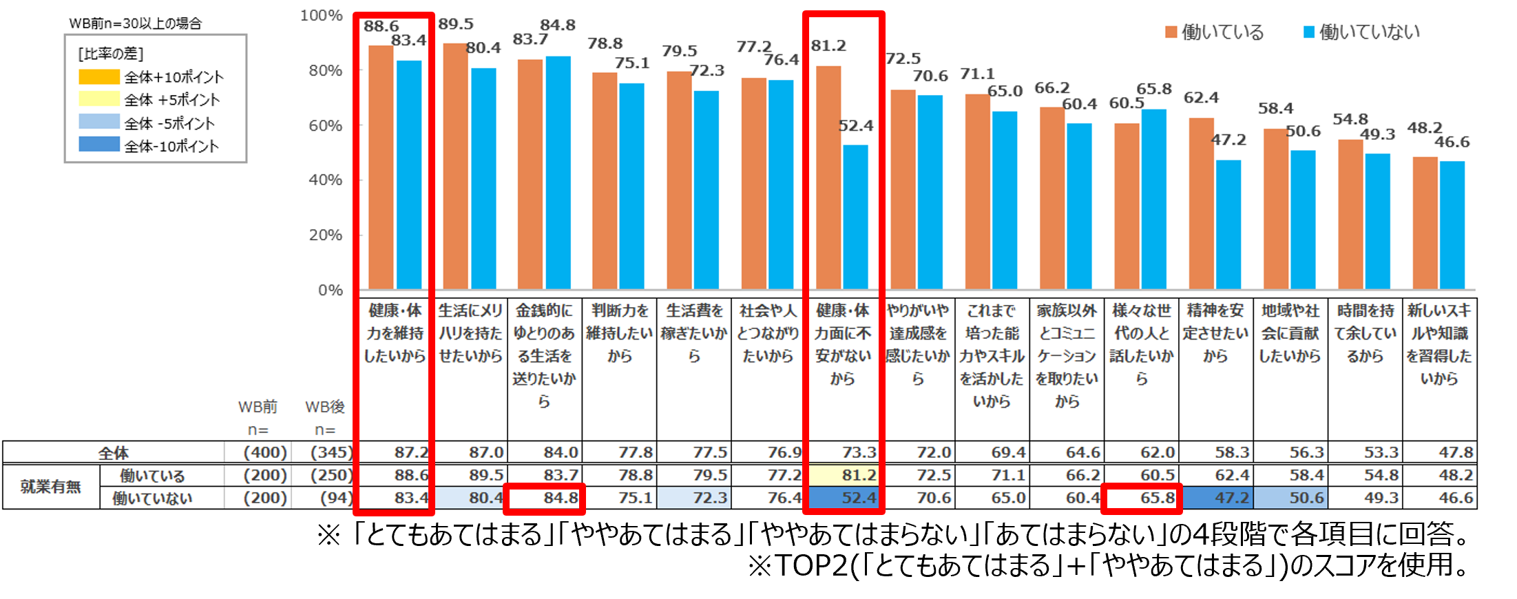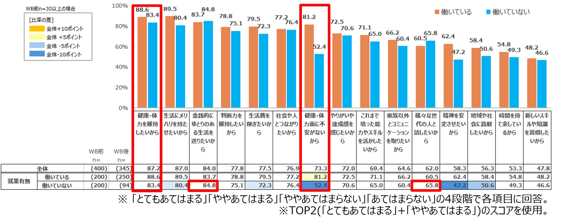 現在の就労有無に関わらず、今後(も)働きたいと回答した人にその理由を尋ねたところ、「健康・体力を維持したいから」が87.2%で1位になった。働いていない人では「健康・体力面に不安がないから」が52.4%と働いている人との差が大きかった。また、働いていない人が働いている人以上に重視してしている点は、「金銭的にゆとりのある生活を送りたいから」(84.8%)と「様々な世代の人と話したいから」(65.8%)だった。