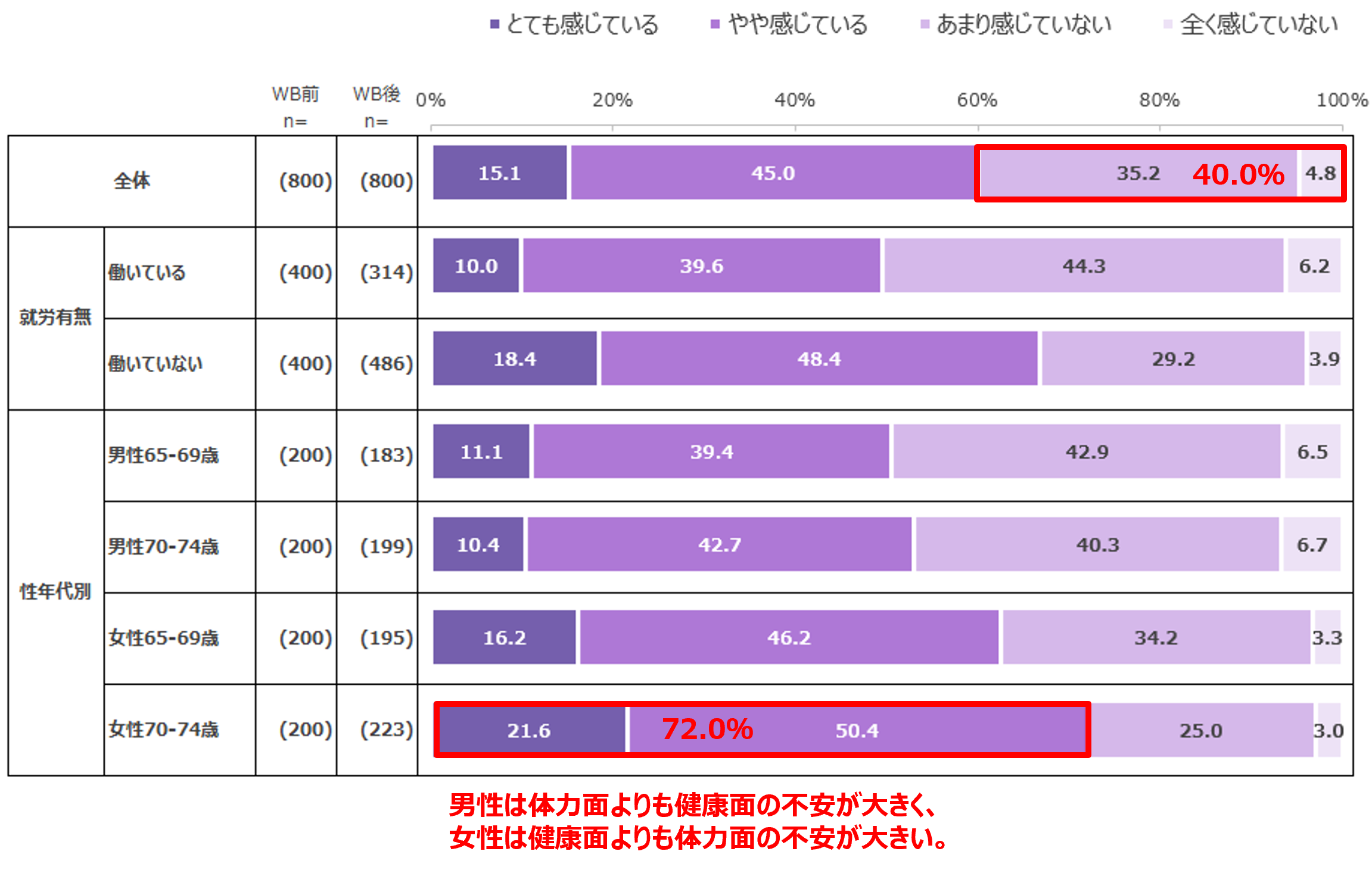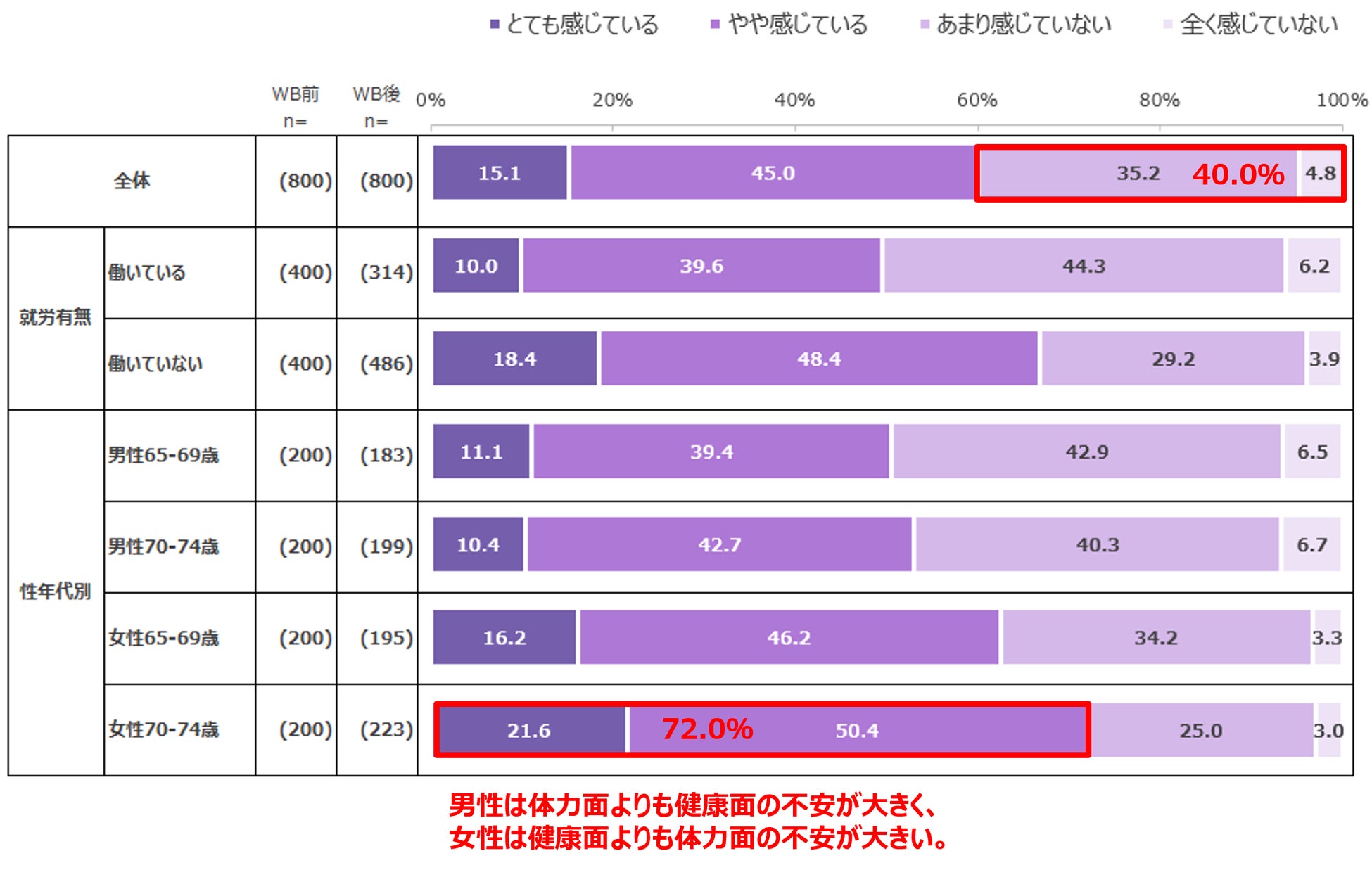 最も不安を感じているのは、70~74歳の女性で62.0%だった。「とても感じている」項目だけで見ると、70~74歳の男性が10.1%にとどまっている状況が分かった。