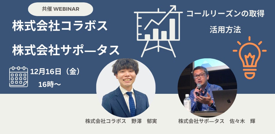 株式会社コラボス(本社:東京都千代田区、代表取締役社長:茂木 貴雄、以下「当社」)と株式会社サポータス(本社:東京都千代田区、代表取締役:永江 恭、以下「サポータス」)は、共同で無料オンラインセミナー「コールリーズンの取得・活用方法」を2022年12月16日(金)16時00分より開催いたします。