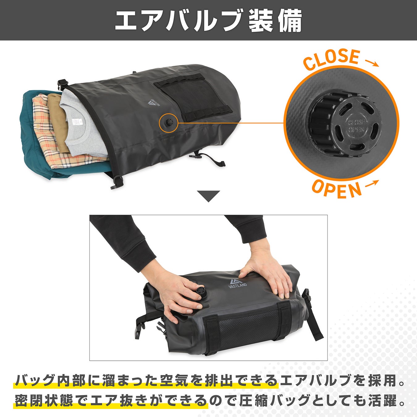 キャンプ・アウトドア用品ブランド「VASTLAND」、IPX6の高い防水性能で雨などの浸水から荷物を保護する「防水バックパック 30L」&「防水ダッフルバッグ 40L」を2023/2/25(土)に発売