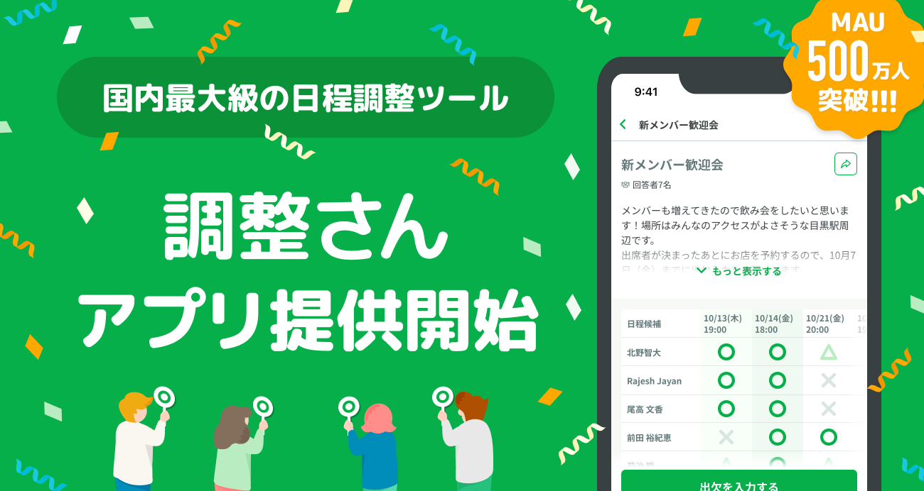 月間アクティブユーザー数 過去最高の500万人突破 日程調整ツール「調整さん」 10/17アプリ提供開始