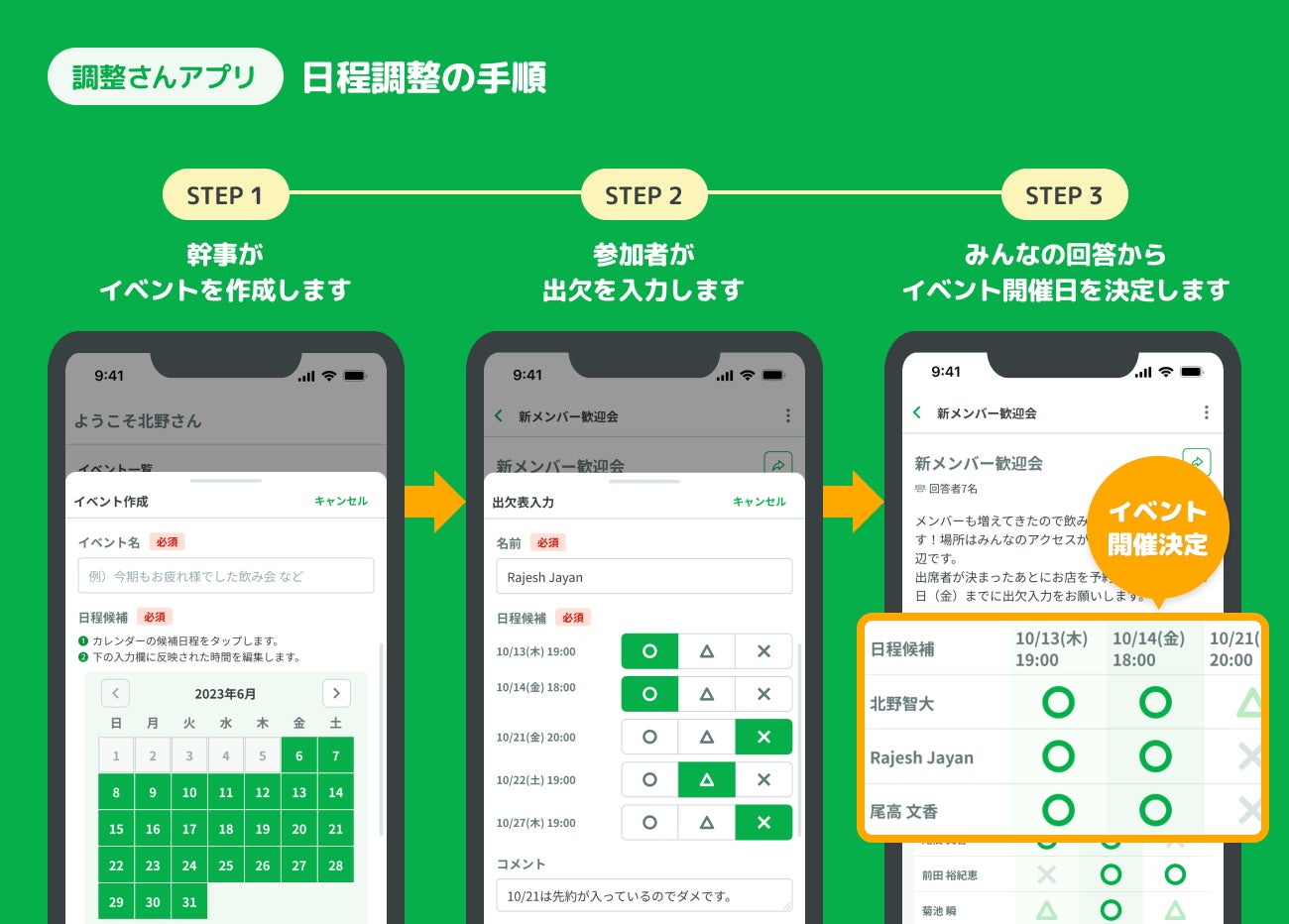 「調整さん」は2006年のサービス開始*以降、飲み会やお出かけ等のあらゆる日程調整に利用されてきました。こうした中で、新型コロナウイルスの感染拡大により緊急事態宣言が発令された2020年4月の日程調整回数が前年同月比で40%程度に落ち込むなど、外出自粛等の影響を受けた時期がありました。当社では、これをきっかけに新型コロナからの回復の時期を目標に据え、ユーザーの利便性を重視した機能拡張の体制を整えてきました。アプリの提供開始に加え、今後はウェブ版でも機能の改善を予定しています。ユーザーの皆さまに、より快適に「調整さん」を活用いただけるよう進めてまいります。