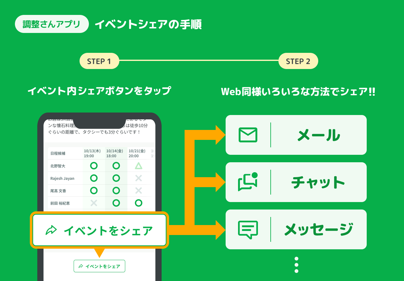 幹事がイベントを作成したら、シェアボタンをクリック。メールやメッセージアプリ等でイベントシェアが可能です。参加者に様々な方法で出欠入力を依頼しましょう。
