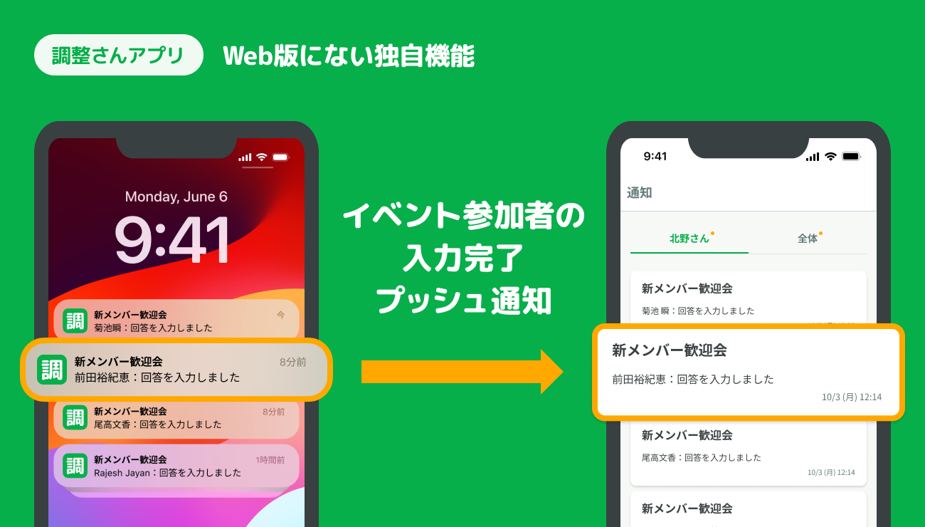 イベントの参加者が日程を入力すると、幹事にプッシュ通知にてお知らせが届きます。また、幹事は参加者が出欠を更新した場合に履歴を確認できます。