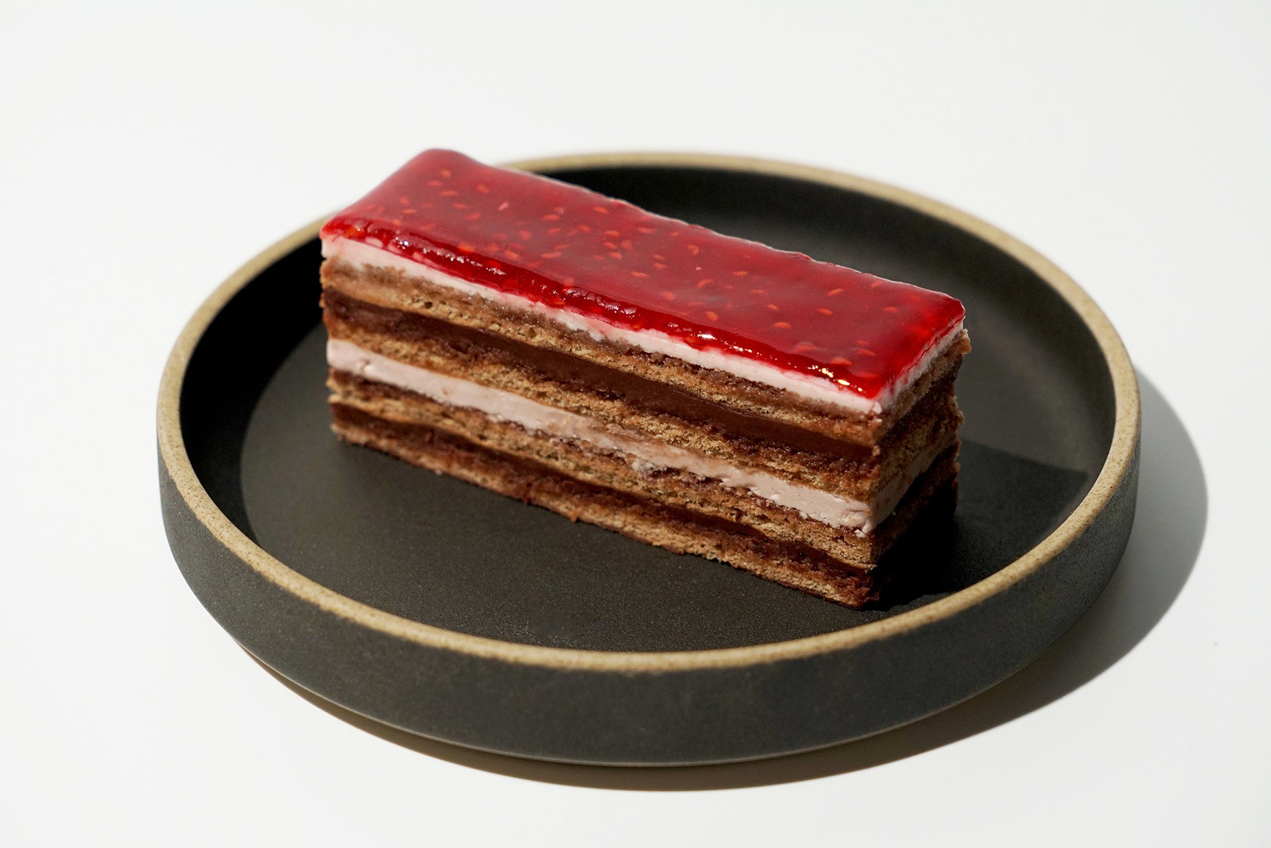 ウガンダ産のカカオとチョコレートを使用。カカオシロップをたっぷり染み込ませたカカオジョコンド生地に、チョコレートガナッシュ、甘酸っぱいラズベリーバタークリームを幾層にも重ねました。仕上げにラズベリージャムを表面に塗り、華やかで愛らしい見た目に。ラズベリーのフルーティーな酸味と、ウガンダ産チョコレートのナッティーな風味が絶妙に調和した、春らしく軽やかなオペラ風ケーキです。