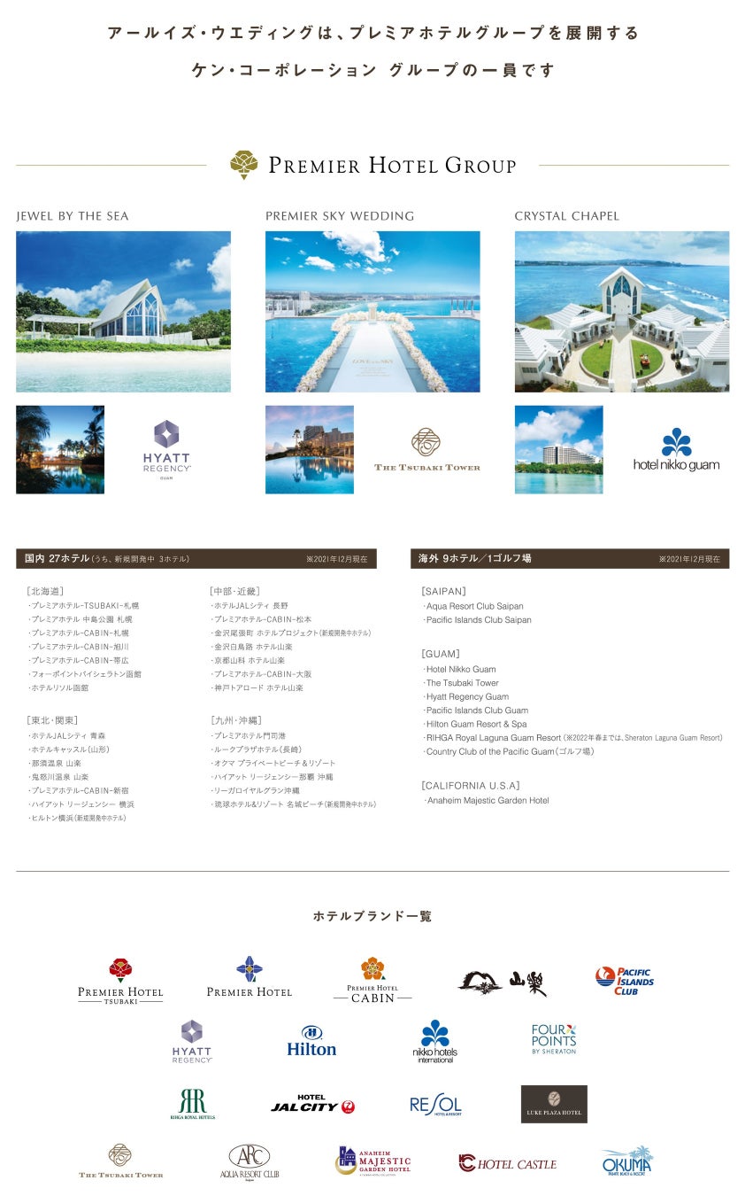 「風までも、思い出になるウエディング」をコンセプトに、ハワイ・グアムの海外挙式・沖縄の国内リゾート挙式を手掛けるウエディングブランド「アールイズ・ウエディング」、オリジナルドレスブランド「アールイズ・ドレス」、映像・写真に特化した「アールイズ・ピクチャーズ」、旅行をサポートするサービス「アールイズ・トラベル」の4ブランドを展開。