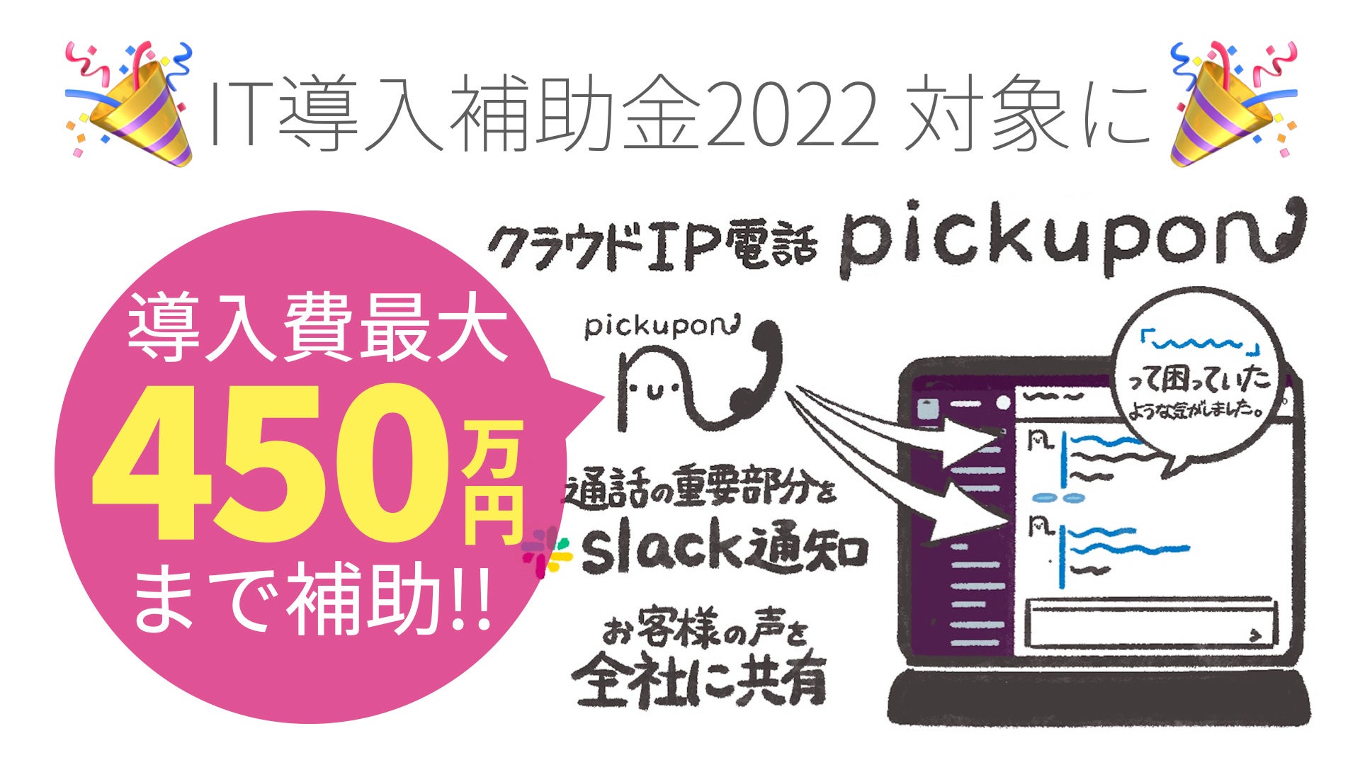 pickupon株式会社(千葉県市川市、代表取締役:小幡洋一)は、経済産業省が実施する「IT導入補助金2022」において、「IT導入支援事業者」に採択されました。これにより、会話サマリーAI電話pickupon(ピクポン)導入にかかる費用(初年度月額利用料含む実費)の1/2以内の金額を補助金として受けとることが可能になります。