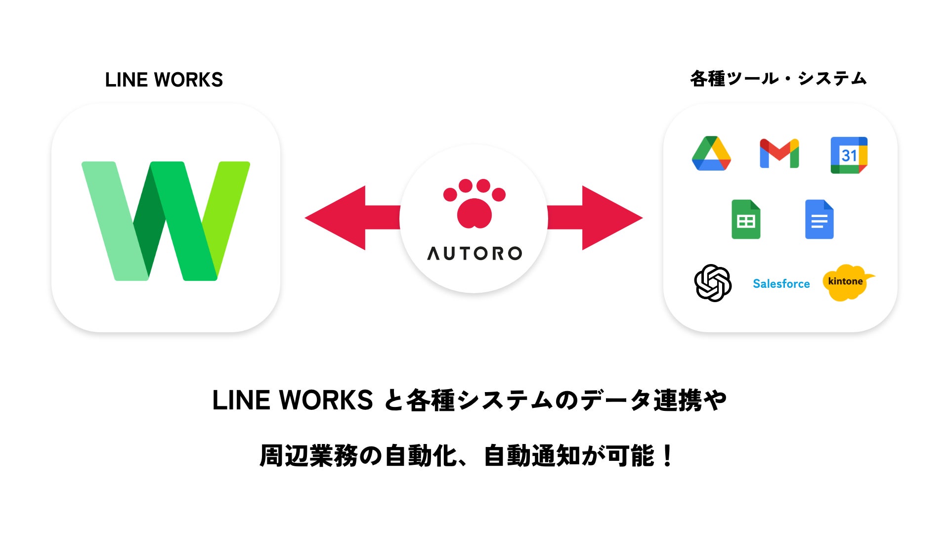 パソコン上の業務を自動化するWeb Auto Robot「AUTORO」を提供するオートロ株式会社(本社:東京都中央区、 代表取締役:福田志郎、 以下当社)は、この度、LINE WORKS株式会社(本社:東京都渋谷区、代表取締役社長:増田 隆一)が提供するビジネス現場のコミュニケーションツール「LINE WORKS」とのAPI連携機能をリリースいたしました。