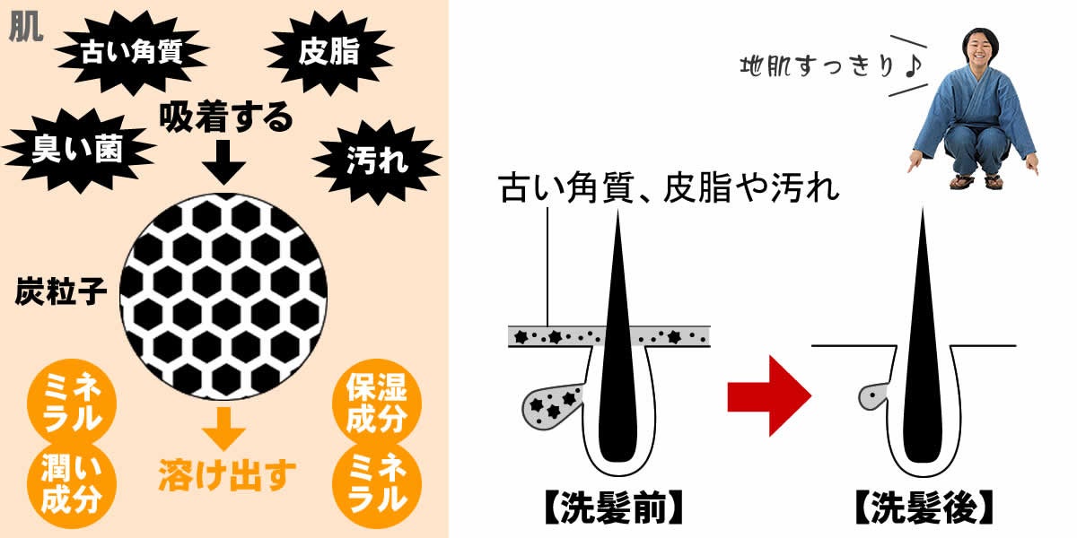 竹炭には竹が地中から吸い上げた天然ミネラルが豊富にバランスよく、水に溶けやすい状態で含まれており、それらが保湿成分となり髪と地肌に浸透します。リンスにはさらにうるおい成分のスクワランを配合し、頭皮の肌バランスを正常に保つことができます。