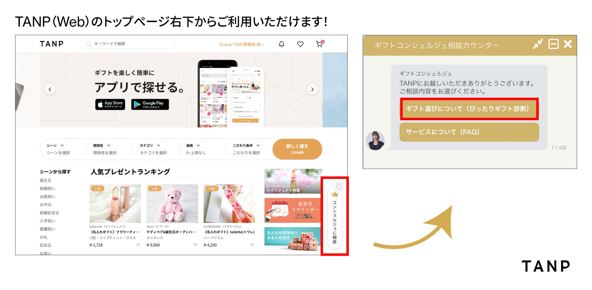 株式会社Gracia(本社:東京都品川区、代表取締役社長:斎藤拓泰)は、運営するギフトEC「TANP」にて、約15,000点(※)の取扱商品から、お客様のご希望に沿った10商品をチャットボットでご提案する「ギフトコンシェルジュ」機能を公開しました。