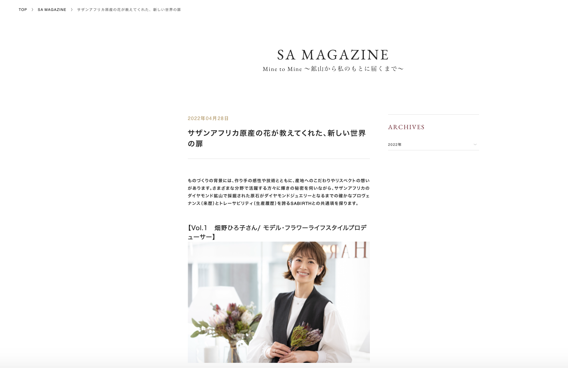 Vol.1 は、モデルであり、フラワーライフスタイルプロデューサーの畑野ひろ子さん。フラワーライフプロデューサーとして活動を始めたきっかけや、畑野さんが愛する、サバースと同じサザンアフリカ由来のネイティブフラワーの魅力、彼女にとってのジュエリーについてを中心に幅広く語って頂きました。