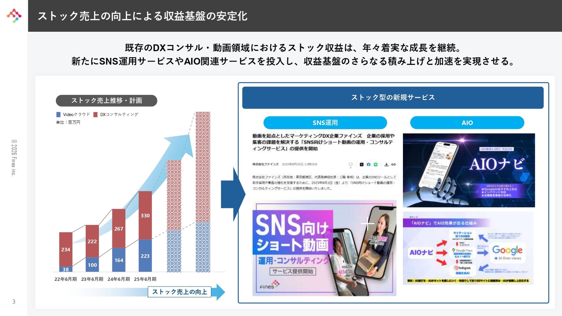 「AIO関連サービス」や「SNS運用サービス」など、市場ニーズの高い新商材を新たに投入しました。既存のDXコンサル・動画領域に加え、これら新規サービスの積み上げにより、収益基盤の更なる安定化と成長の加速を実現させます。
