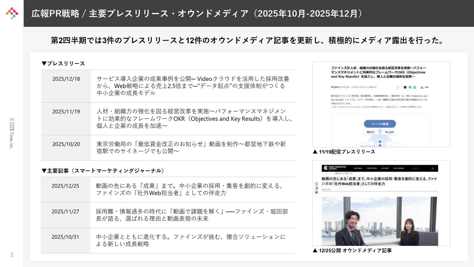 ファインズは2025年7月に中長期的な経営改革の実施を発表。CxO人材や戦略コンサルタントを招聘し、動画を起点としたマーケティングDX企業から、より包括的な経営ソリューションを提供する企業となるために経営戦略の高度化と企業価値の向上を図っています。