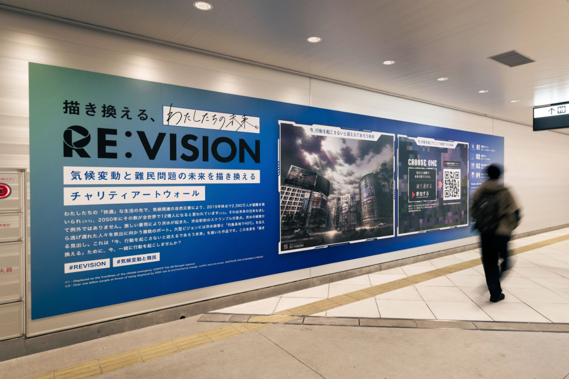 国連UNHCR協会と連携し、アートの力で気候変動と難民問題に対する無関心を打破し、解決に向けた一歩と、その連帯をつくることで、気候変動と難民問題の未来を「描き換える」ためのプロジェクト。アーティスト・東京幻想とコラボしたチャリティアートウォールは、渋谷駅東口地下広場にOOH広告として掲載。