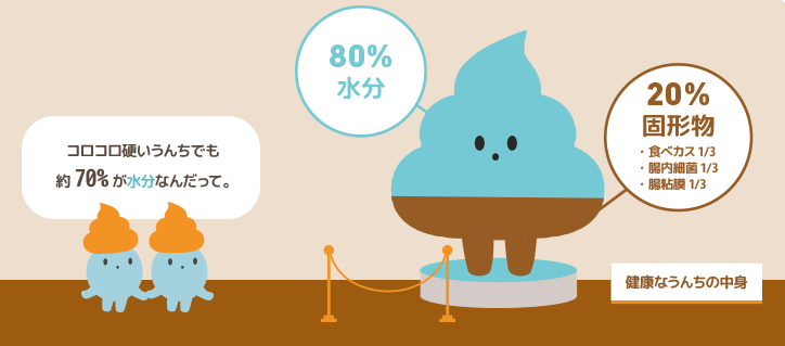 水分不足になると腸の内容物が腸内を通過しづらくなったり便が硬くなります。便の約8割は水分でできているため、こまめに水分を摂ることで便の状態を整えましょう。