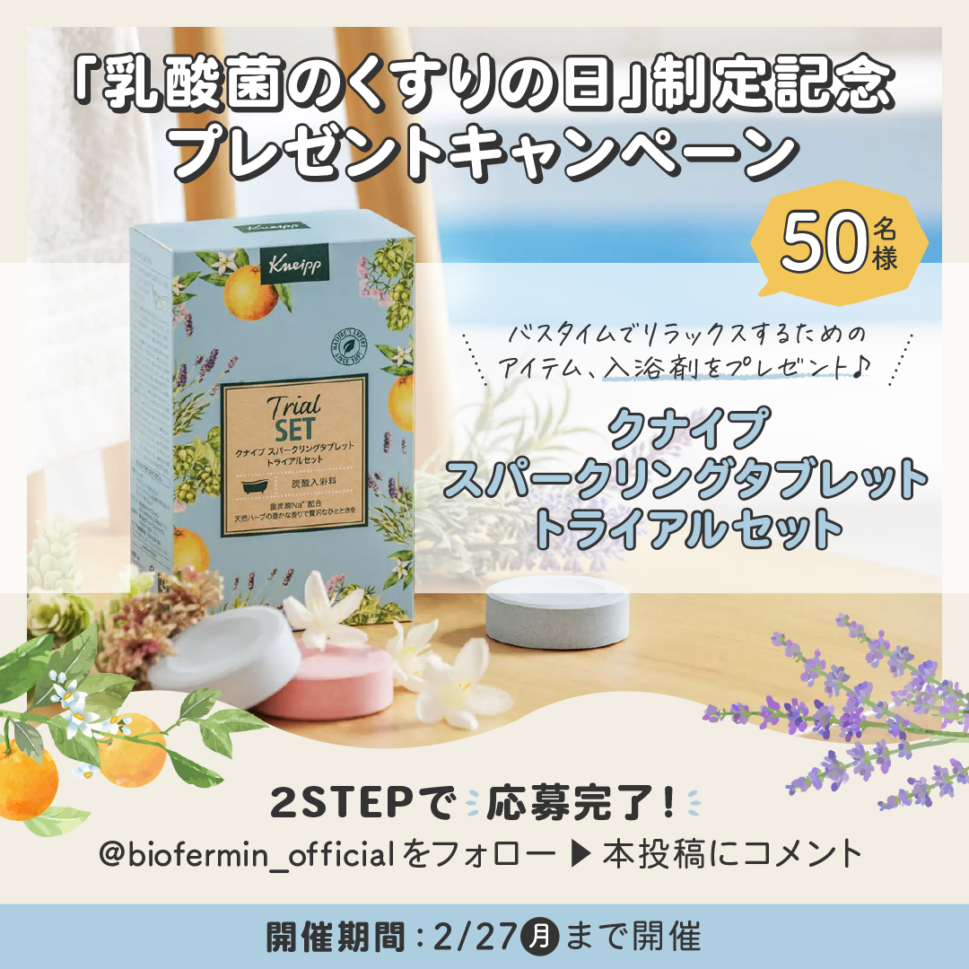 2月12日の「乳酸菌のくすりの日」を記念して、Twitter/Instagramそれぞれ抽選で50名様にプレゼントが当たるキャンペーンを開催します。