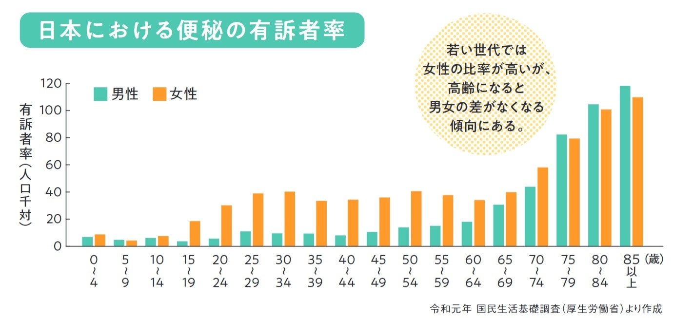 年齢や性別を問わず多くの人が悩まされている便秘。令和元年の国民生活基礎調査によると、便秘に悩む人は60代前半までは圧倒的に女性が多いのですが、それ以降は男性も増え、70代後半では男性の方が多くなっています。