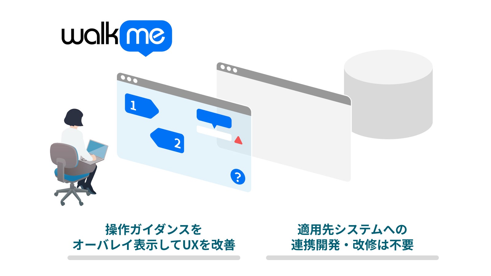 WalkMeのクラウドベースのデジタル・アダプション・プラットフォームを活⽤することで、組織は業務アプリケーショ ンの活⽤状況を分析・改善・運⽤し、デジタルトランスフォメーション(DX)を加速させるとともに、投資対効果を最⼤化させることが可能となります。WalkMe独⾃の技術によるコードフリーのプラットフォームは、経営者やビジネスリーダーにシステム活⽤状況を可視化し、また、従業員や顧客のユーザー・エクスペリエンス、⽣産性、効率を向上させます。