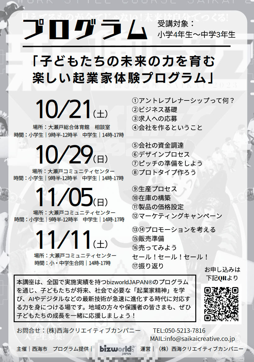 「Bizworld」( https://bizworldjapan.org )は、米国で25年以上の歴史を誇り、全世界で80万人以上の実績を持つ、注目のアントレプレナーシッププログラムです。当社は、西海市から受託を受け、本講座の運営を行います。