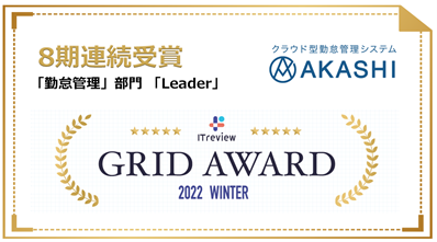 クラウド型勤怠管理システム「AKASHI」 「ITreview Grid Award」の勤怠管理部門で高い顧客満足度と認知度を獲得 最高位の「Leader」を8期連続受賞