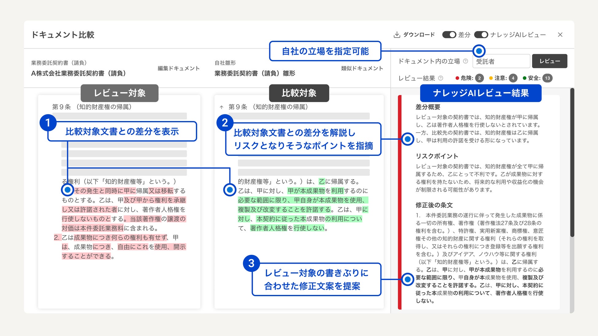 今回、クローズドβテストが始まるナレッジAIレビュー機能は、過去の契約書や自社雛形との権利義務関係の違いや条件の違いから自動でリスクポイントの検出や修正文案を作成するため、従来のAI契約書レビューで課題があった契約書にも対応することが可能になります。