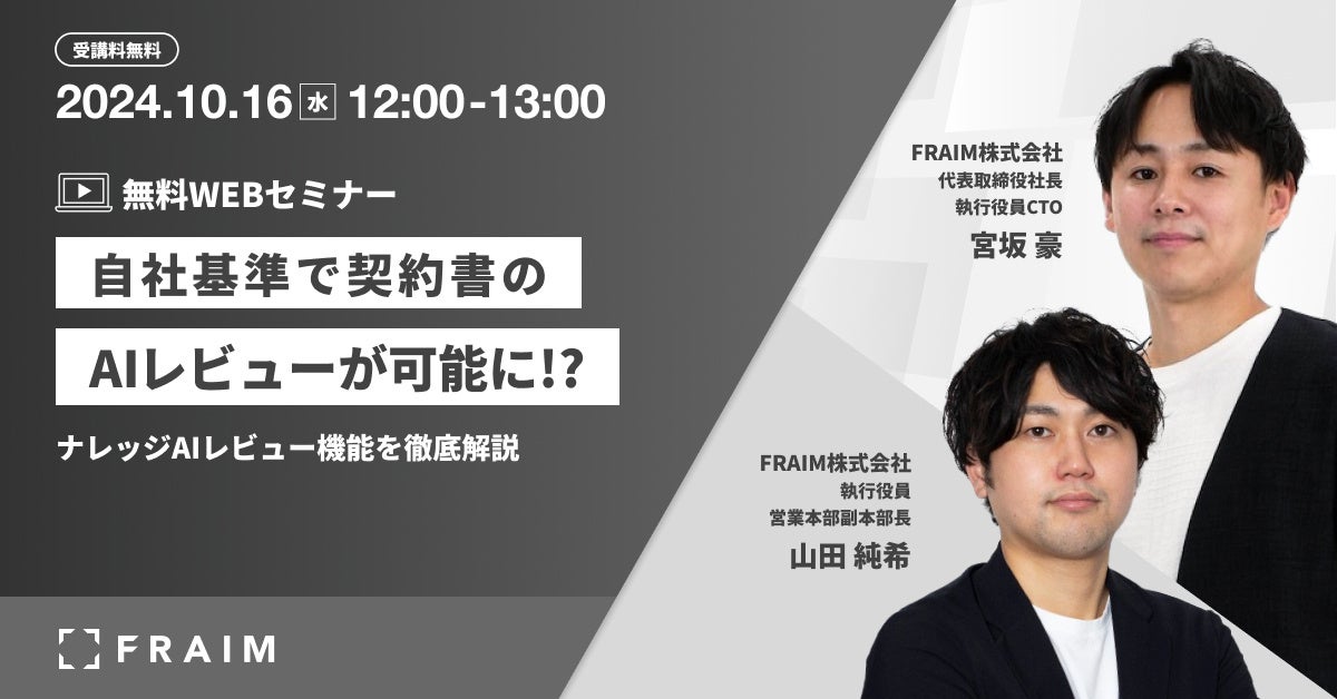 AIを搭載したクラウド ドキュメント ワークスペース「LAWGUE」を提供するFRAIM株式会社(本社:東京都渋谷区、代表取締役社長:宮坂豪、以下「FRAIM」)は、自社ナレッジを踏まえ、生成AIを活用したリスクの抽出や修正文案を自動で生成できる「ナレッジAIレビュー機能」のクローズドβテストを10月から開始いたします。今回のテストを踏まえ、2024年中のβ版リリースを予定しております。