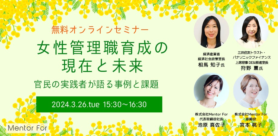 ファシリテーターはMentor For 取締役の宮本桃子が務め、女性管理職の育成に関する最新の政府の取り組みや方針、女性管理職の育成に関する課題や成功事例などについて鋭く掘り下げていきます。
