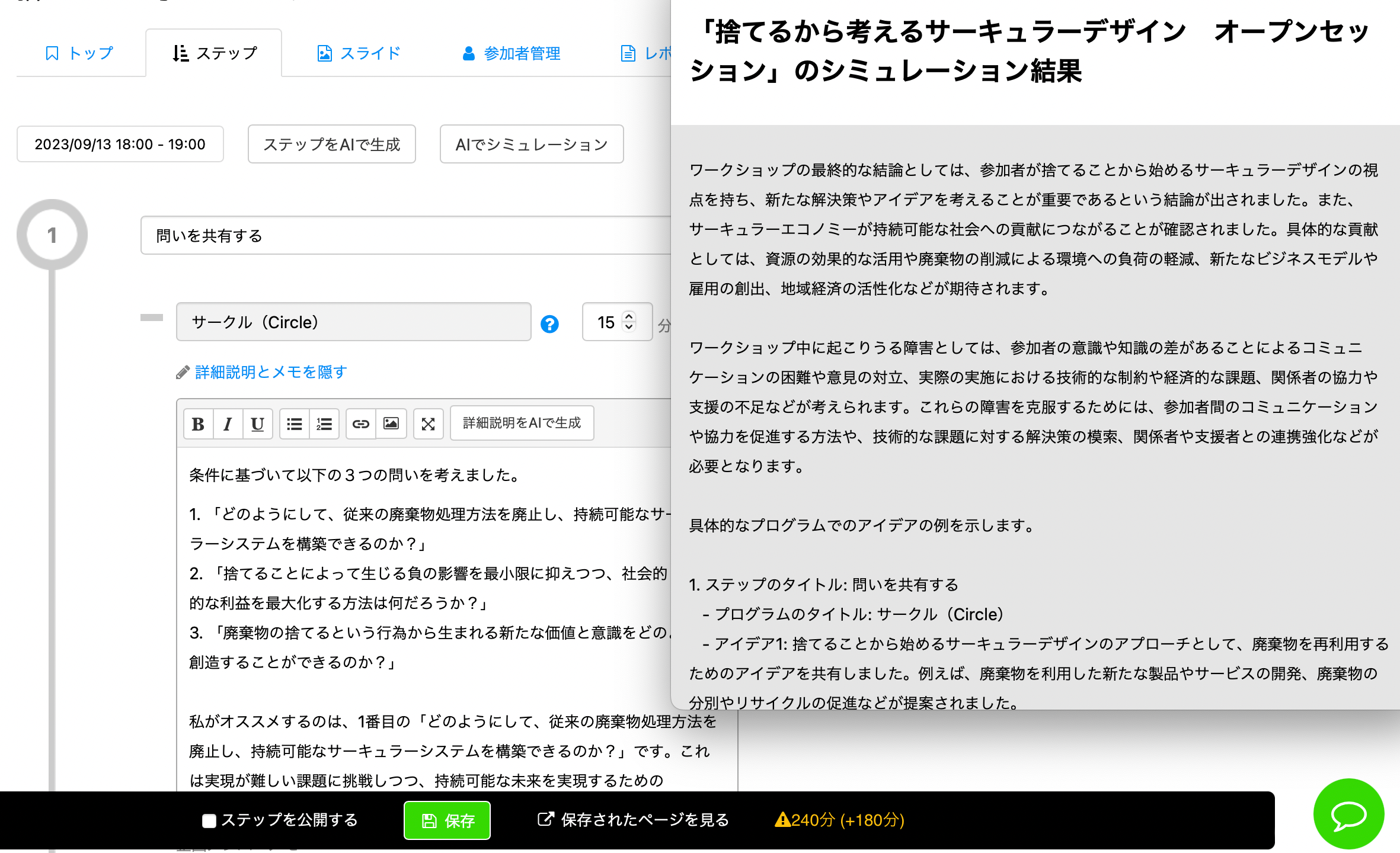 セッションの各ステップも自動作成。セッションの企画やファシリテーション経験が少ない方でも設計できるよう、サポートします。