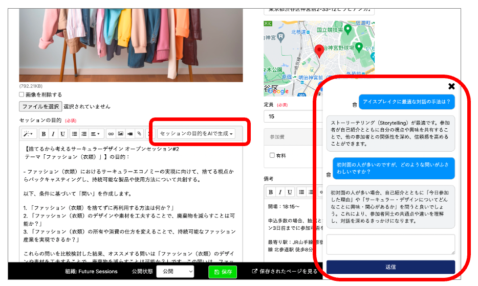 OpenAI提供のAPI(gpt-3.5)を利用し、OUR FUTURESに登録されている公開済みセッション約1,400件をAIが学習、分析し、最適なセッションプログラムを提案します。