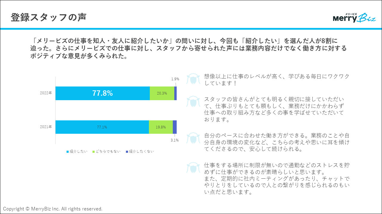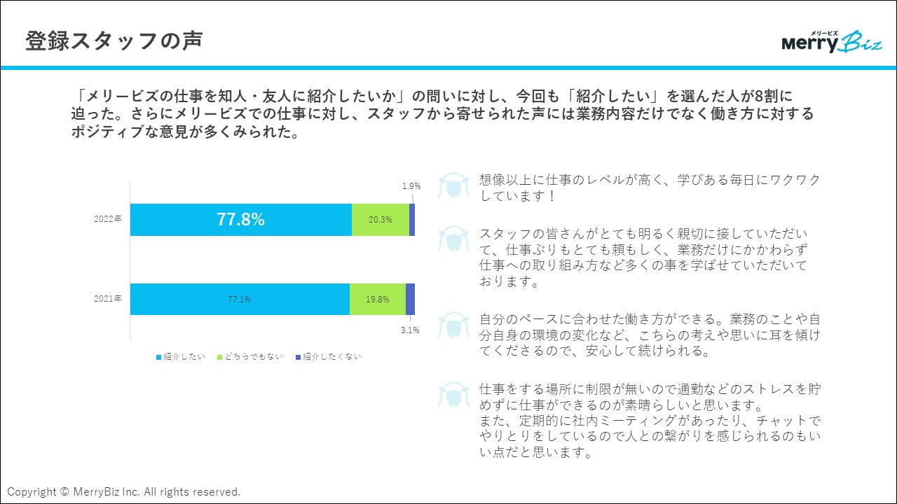 「メリービズでのお仕事を、知人・友人に紹介したいと思いますか?」に対して、77.8%が「紹介したい」と回答し、昨年の77.1%とほぼ同等の結果となりました。理由として寄せられたコメントを一部ご紹介します。