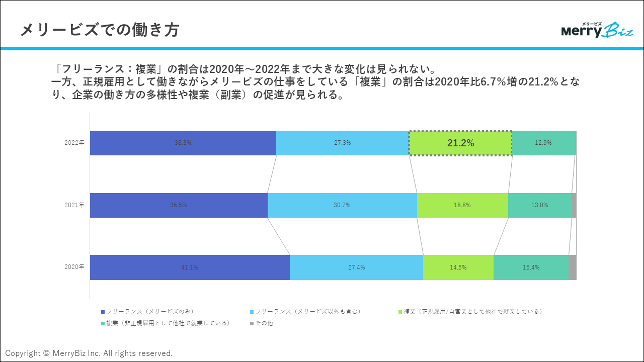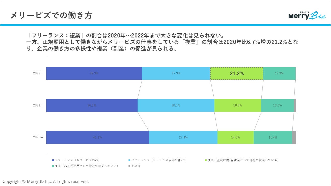 - 昨年に引き続き、働き方に関する設問では「メリービズ専業」が最も多く、38.3%を占めています。一方で正社員雇用と平行しての「副業(複業)」の割合が年々増加しており、今年は21.2%と初めて2割を超えました。
