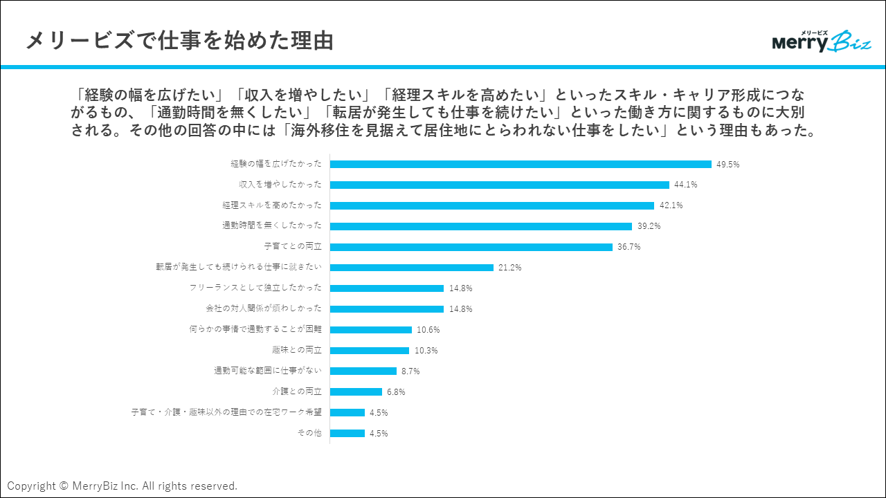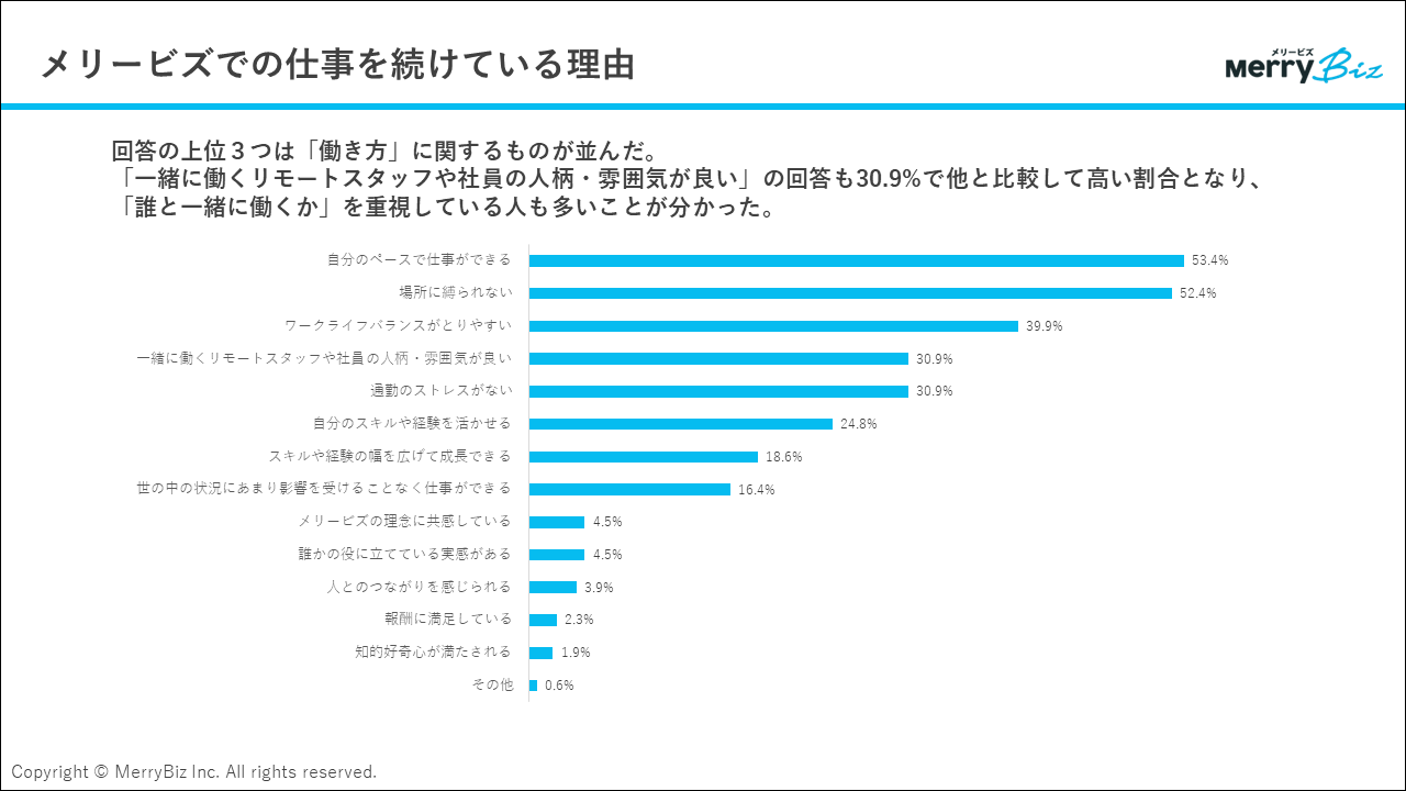 - メリービズでの仕事を始めた理由の上位3つがスキル・収入に関する選択肢であるのに対し、続けている理由の上位3つは働き方・ワークライフバランスに関するものが占めています。