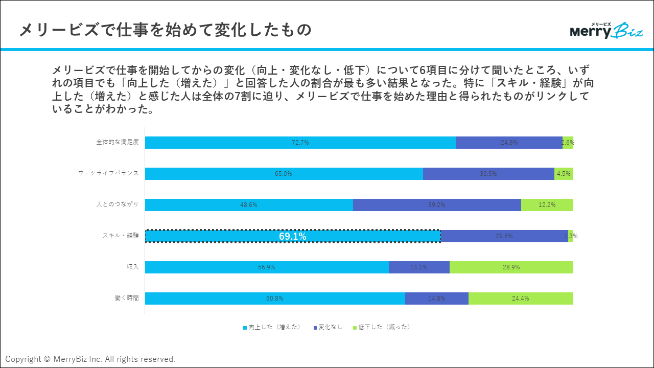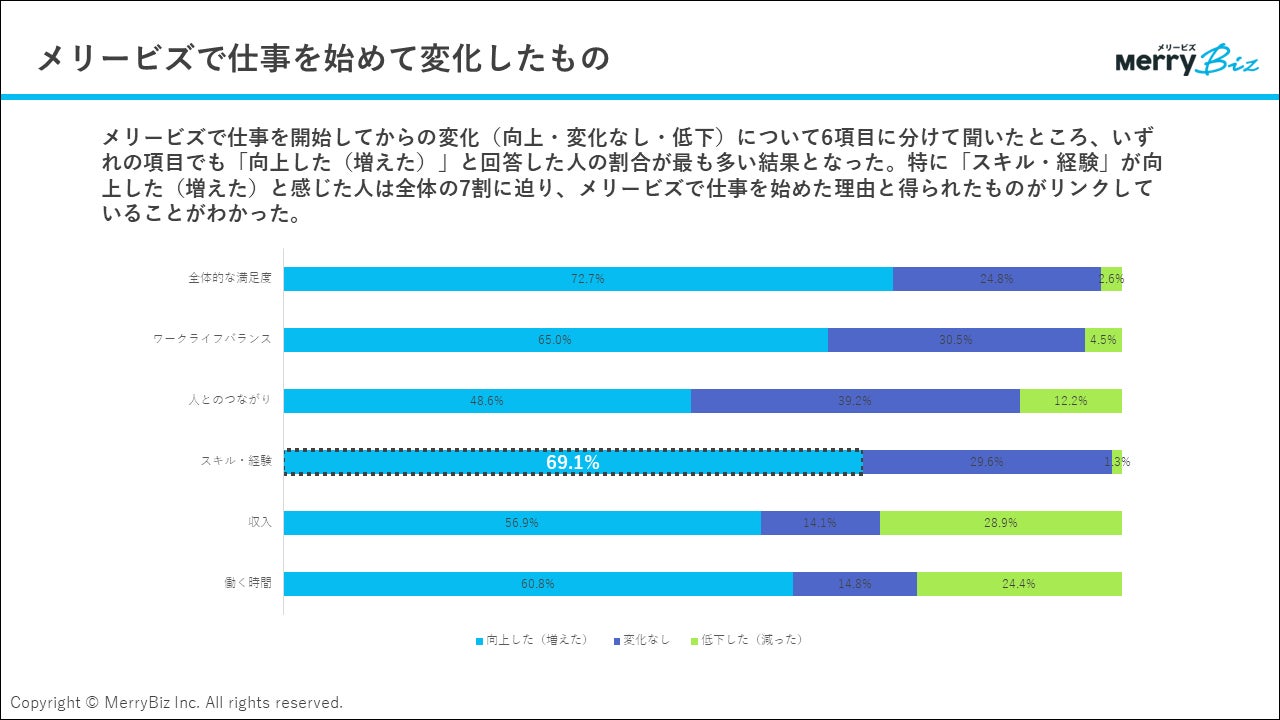 一方で、「メリービズのお仕事を始めてから向上したもの」では「スキル・経験」が69.1%となり、「始めた理由」のスキル面について7割近くの人が向上していると感じていることがわかりました。