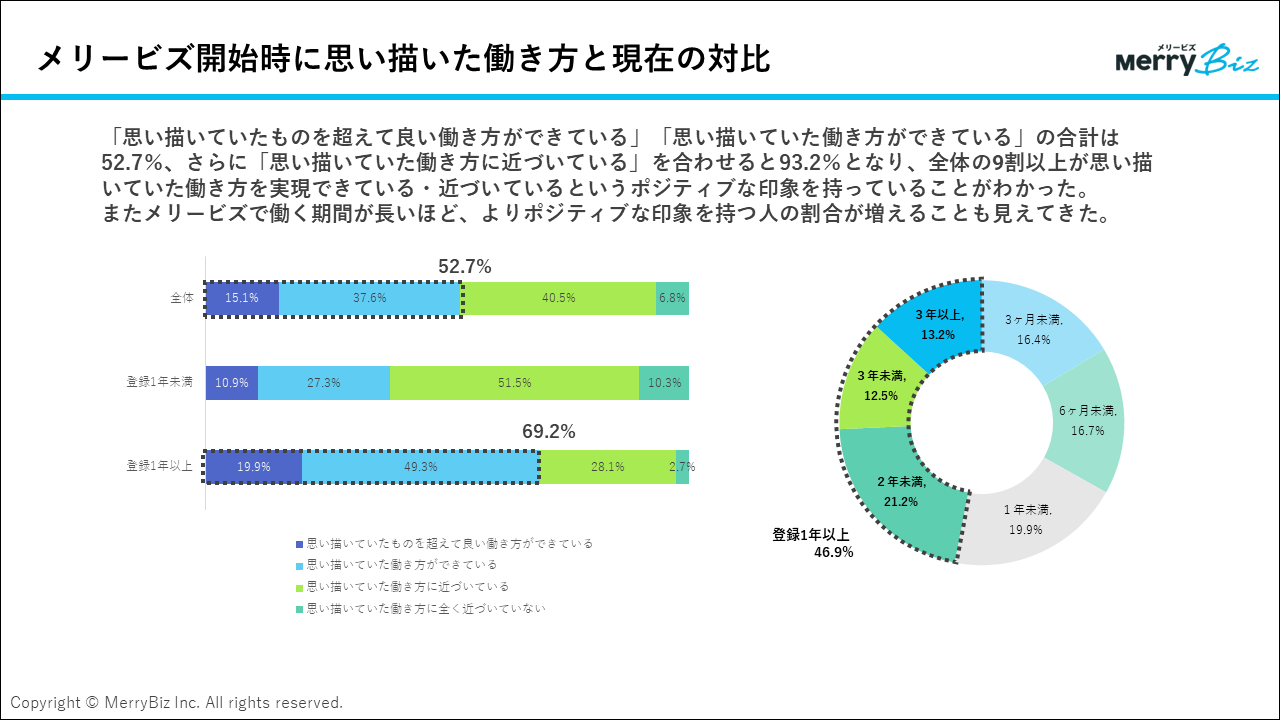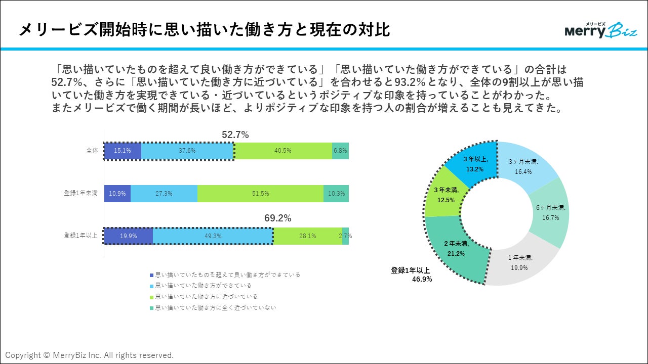 また、「思い描いていた(もしくはそれ以上の)働き方ができている」と回答した人を「メリービズ登録期間の長さ」の観点からみると、登録して1年未満の人では28.2%、1年以上経過している人では69.2%と大きな差がみられました。