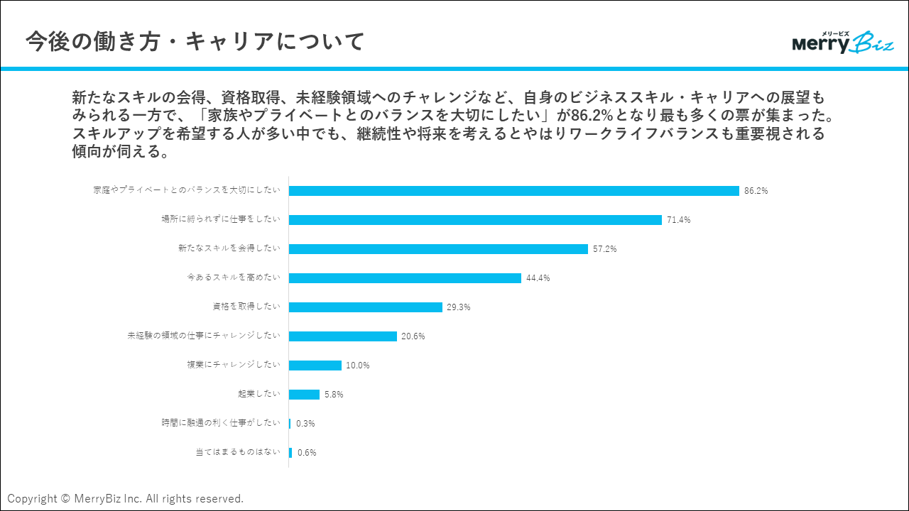 今後の働き方・キャリアについての希望を聞く設問では、「家庭やプライベートとのバランスを大切にしたい」が最も多く86.2%の人が回答しています。