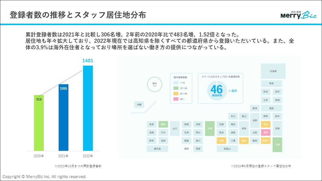- 累計スタッフ登録者数は、昨年から300名以上増加し、1,401名(2022年10月時点)となりました。
