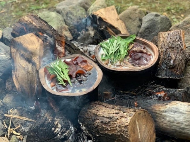 ●メニューは、縄文キノコ鍋もしくは縄文潮鍋・焚火で大胆な焼料理・燻料理・栗やどんぐりスイーツです。
