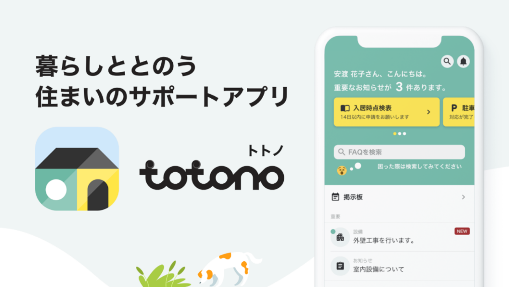 入居者アプリ「totono」は、不動産管理会社と入居者を繋ぐスマートフォンアプリケーションです。入居者はこれまで不動産管理会社とのやりとりは電話や書類手続といった手段に限られていましたが、入居者アプリ「totono」を利用することでアプリ内から契約内容が確認でき、不動産管理会社への問い合わせや各種申請もアプリ内で行うことが可能になります。また、不動産管理会社にとっては情報の一元管理や電話対応の抑制、ペーパーレスに繋がり、入居者満足度向上と業務効率化を同時に実現します。