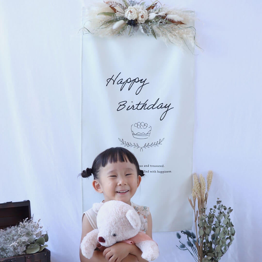 テディベアと月齢カードを置くだけで記録写真が簡単に撮影できます。1歳の誕生日を迎えた後はタペストリーをバルーンや花と一緒に部屋の壁にコーディネートしてお祝い。 フォトグッズや誕生日会の飾り付けとしてご利用いただけます。