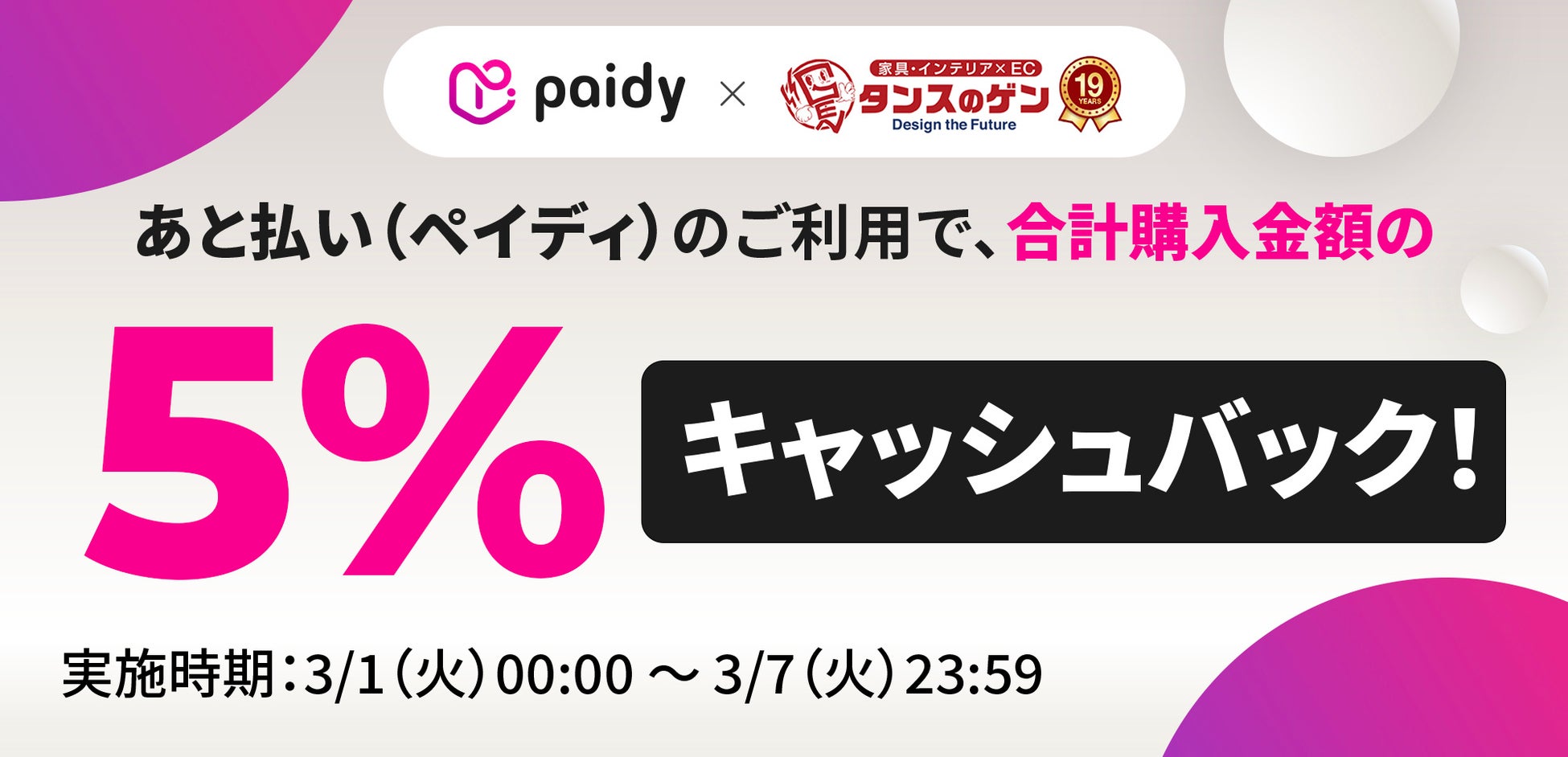 家具・インテリア×EC事業を展開するタンスのゲン株式会社(以下タンスのゲン、本社:福岡県大川市、代表取締役:橋爪福寿)は、2022年3月1日(火)~3月7日(火)の期間、株式会社 Paidy が提供する“あと払いサービス“「ペイディ」でご購入された合計金額の5%が、キャッシュバックされるキャンペーンを開催します。