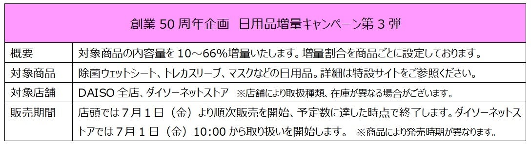 ~大創産業、お客様への感謝を込めた創業50周年企画~DAISO全店で日用品増量キャンペーン第3弾を開始
