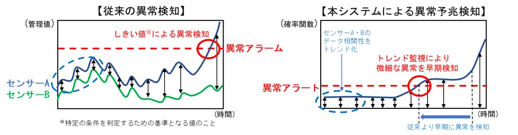 従来は、製油所・製造所の石油精製装置や石油化学装置の計器データを監視し、操業中の異変を検知していましたが、本システムでは各種計器データの相関性を活用し、操業中の微細な異変を初期段階で検知できます。既知の装置トラブルだけでなく、未経験のトラブルに対しても、機械学習を用いた高度な異常予兆検知システムを導入・活用することで、未然にトラブルを防ぎ、装置の運転信頼性を向上させます。当社の製油所では、既にさまざまなシステム※1を導入し、デジタルトランスフォーメーション(DX)を通じて効率的で安定したエネルギー供給の維持に取り組んでいます。本システムは、製油所・製造所装置の運転信頼性の向上を目指して、取り組みをさらに強化するものです。